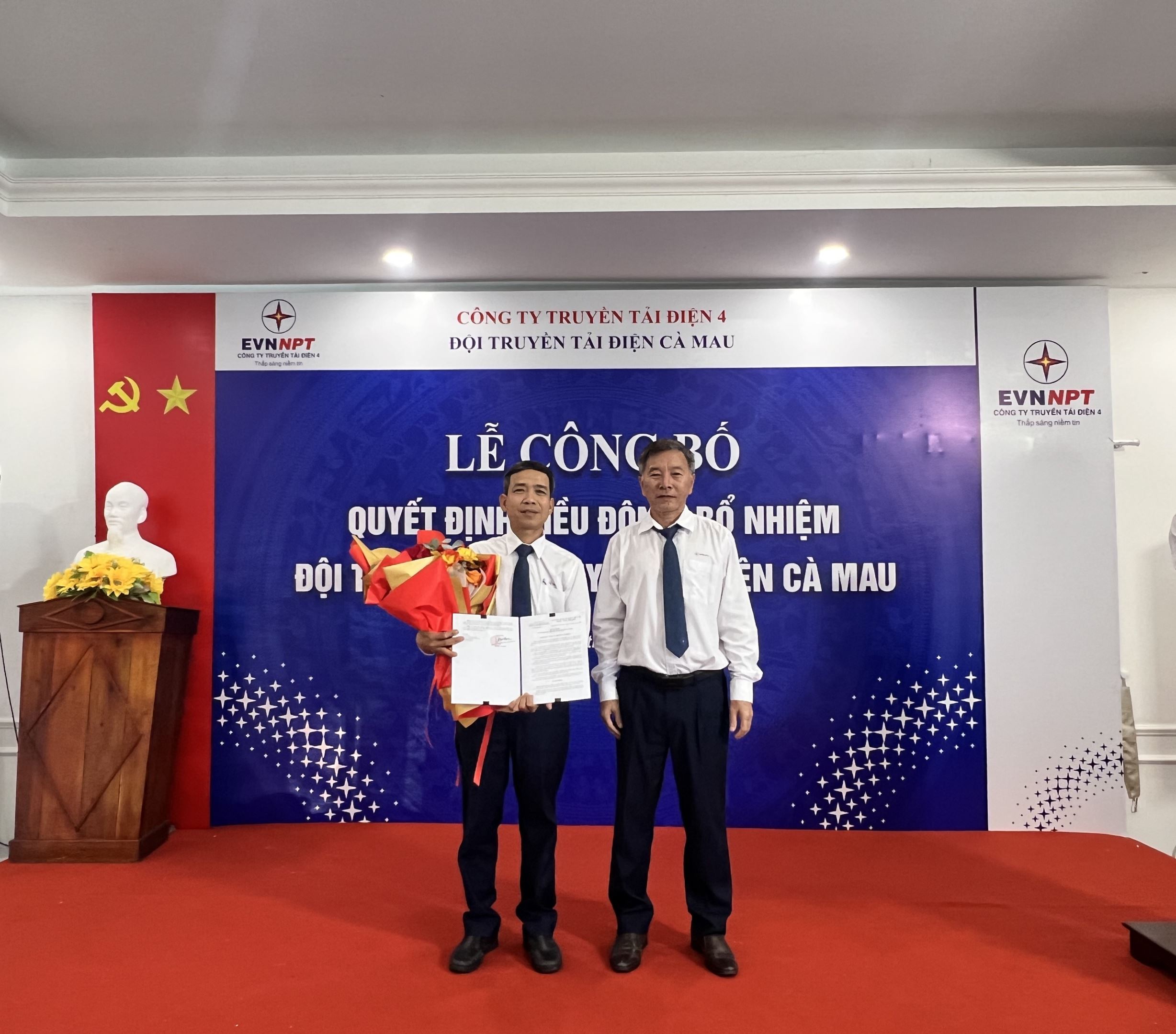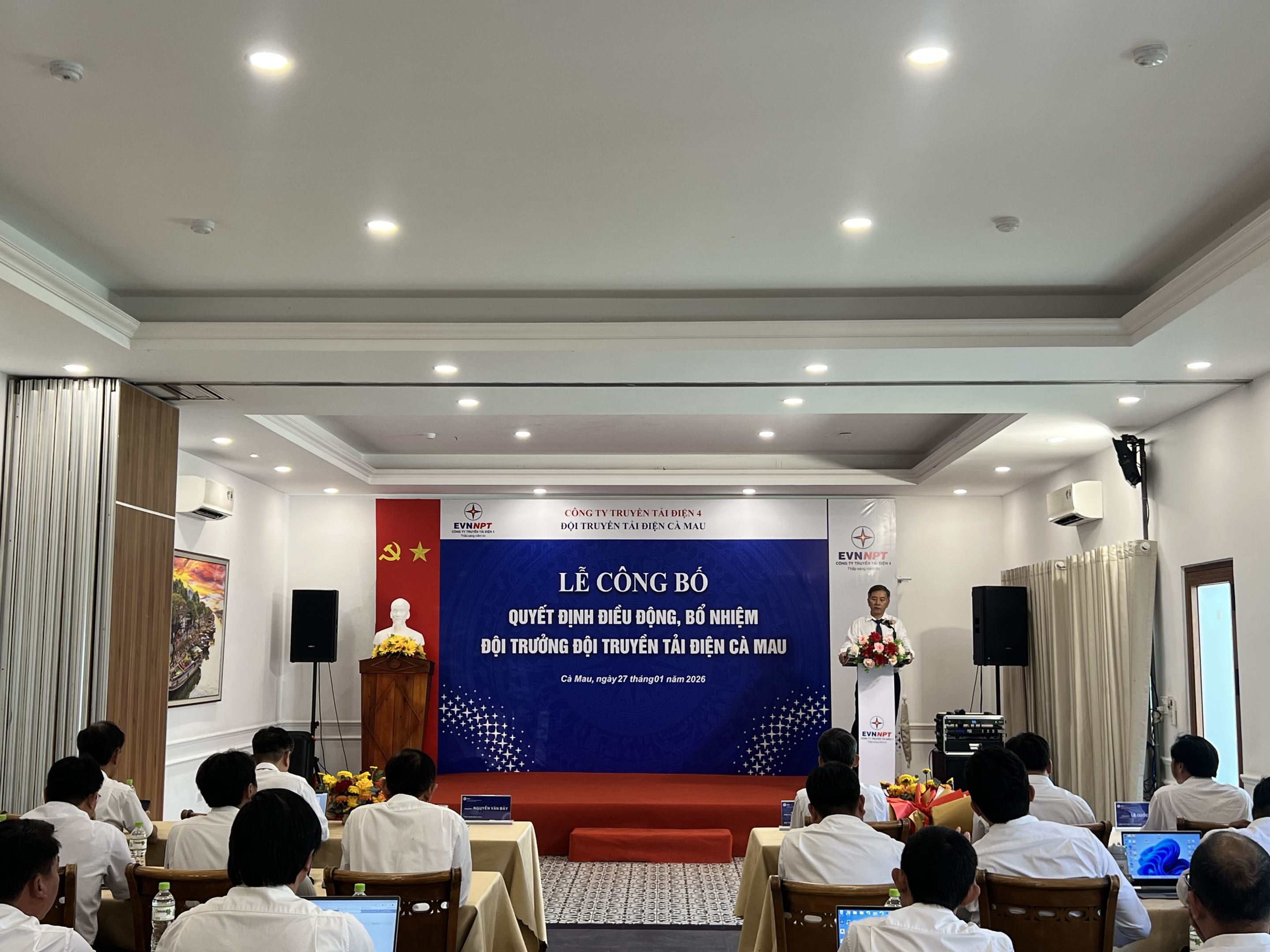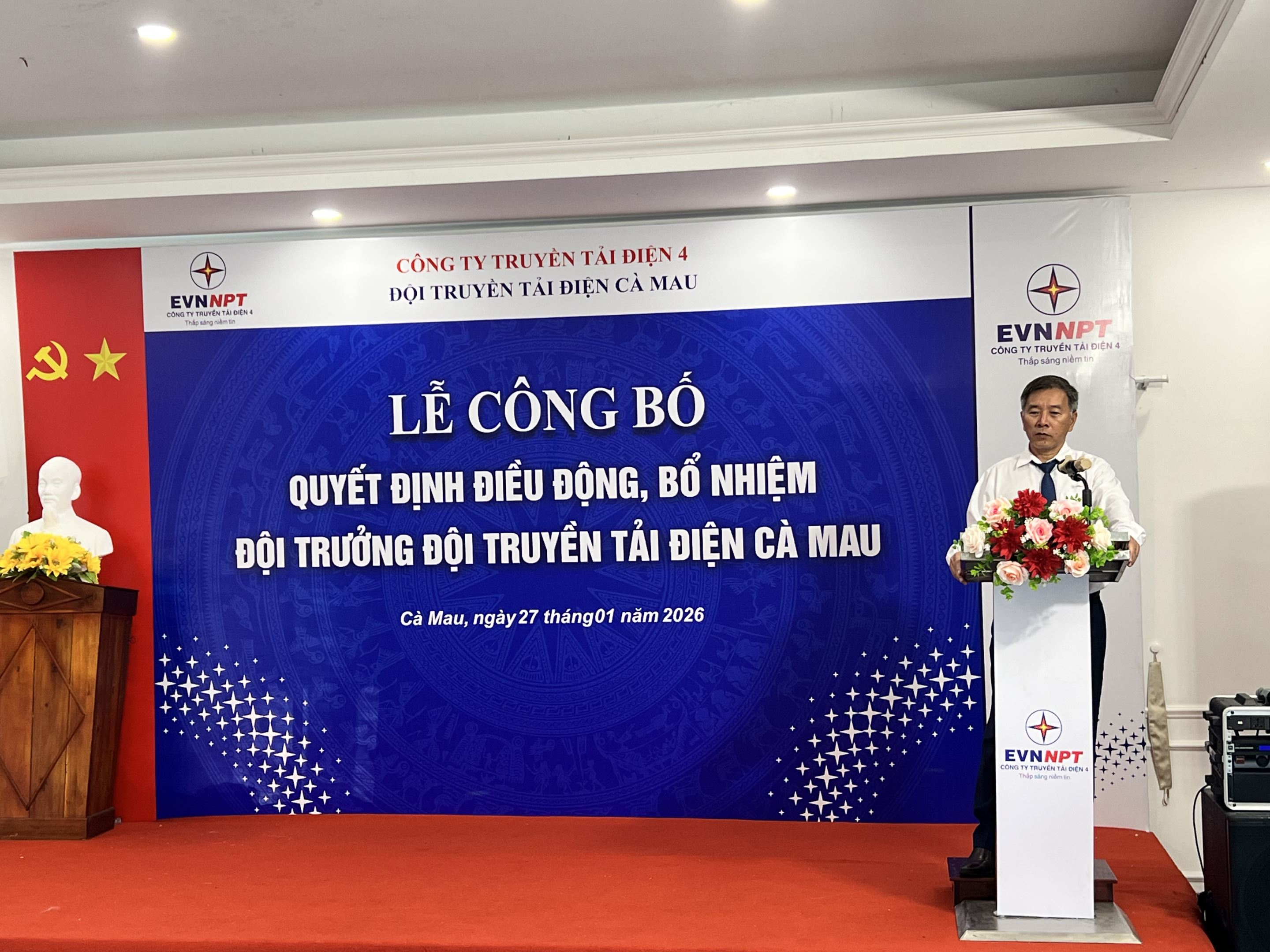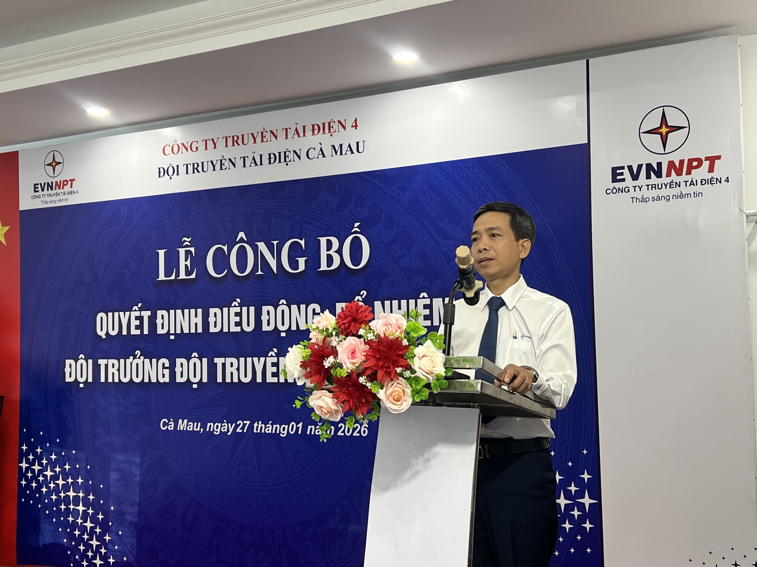Tại buổi lễ, đồng chí Huỳnh Thanh Sơn – Phó Trưởng phòng Tổ chức và Nhân sự Công ty Truyền tải điện 4 đã công bố Quyết định của Công ty Truyền tải điện 4 về việc điều động và bổ nhiệm cán bộ. Quyết định nêu rõ việc điều động, bổ nhiệm chức danh Đội trưởng Đội Truyền tải điện Cà Mau đối với đồng chí Trần Nhật Trung, thể hiện sự ghi nhận của lãnh đạo Công ty đối với quá trình công tác, rèn luyện và những đóng góp của đồng chí trong thời gian qua, đồng thời giao phó trọng trách mới trong giai đoạn tới.