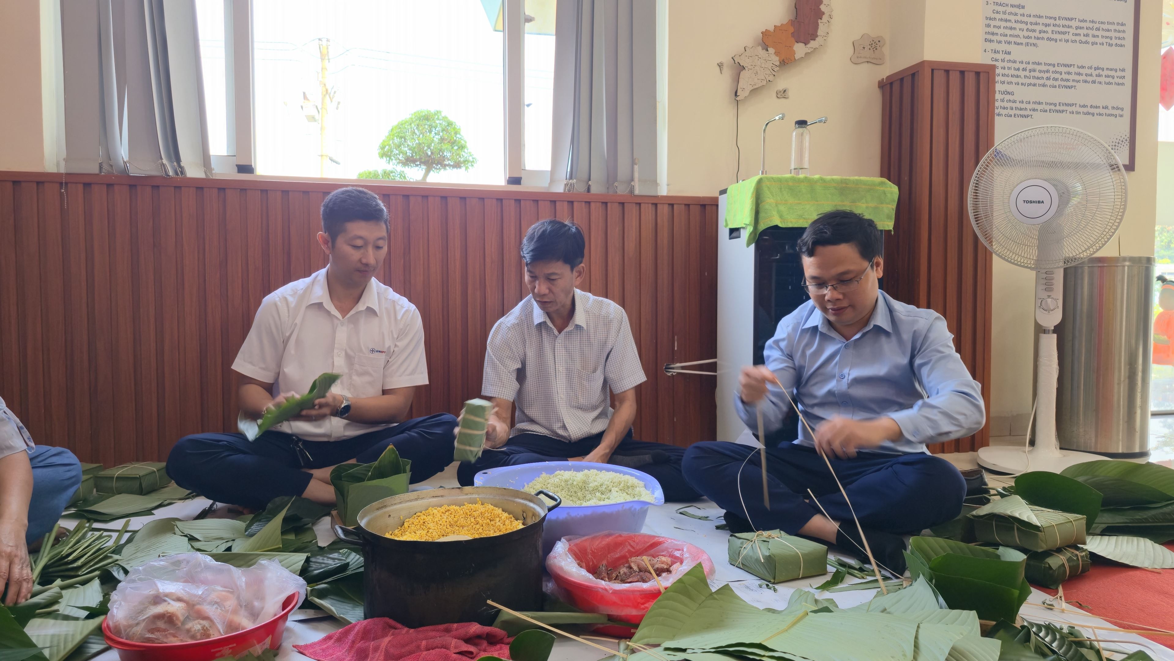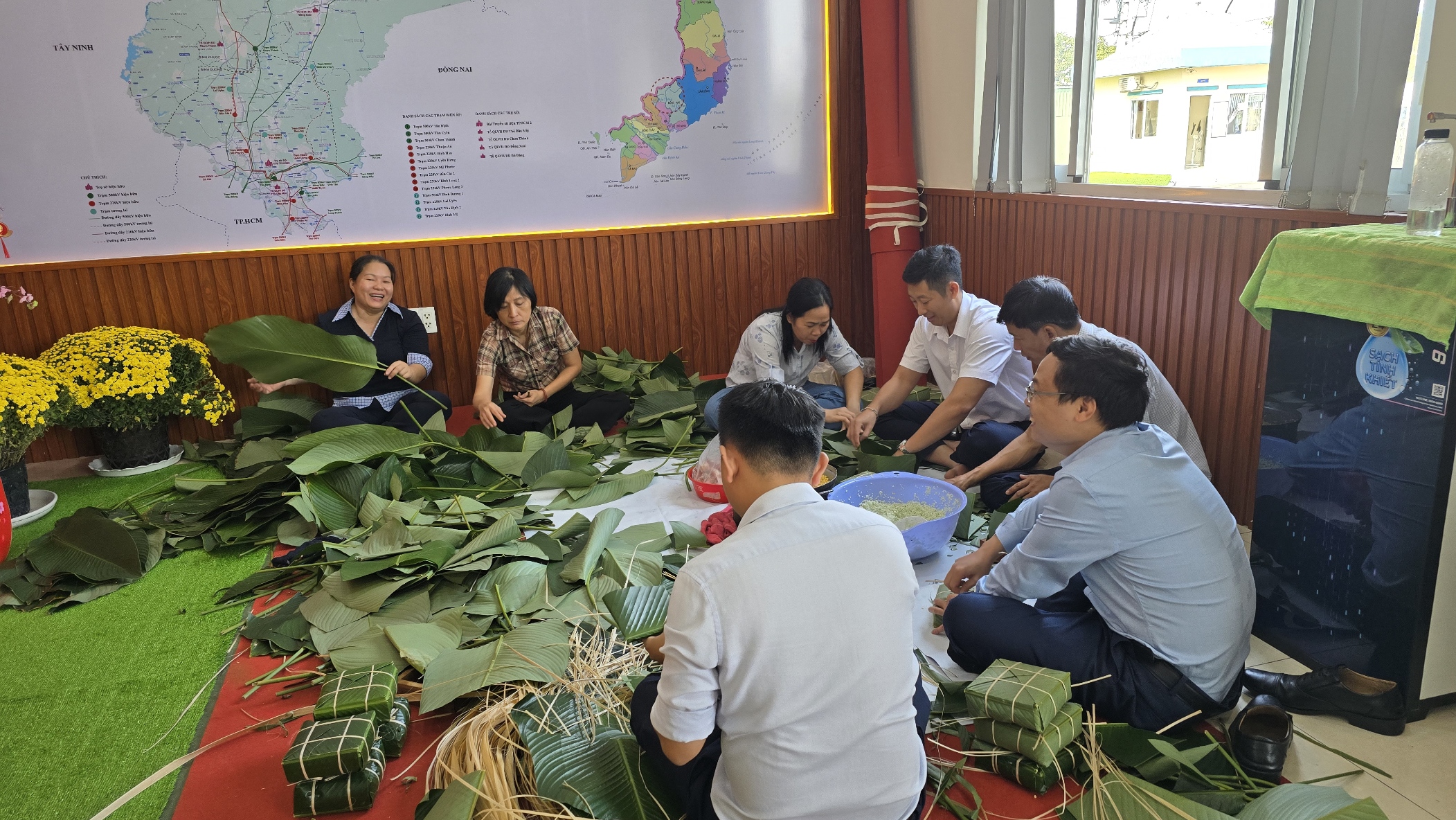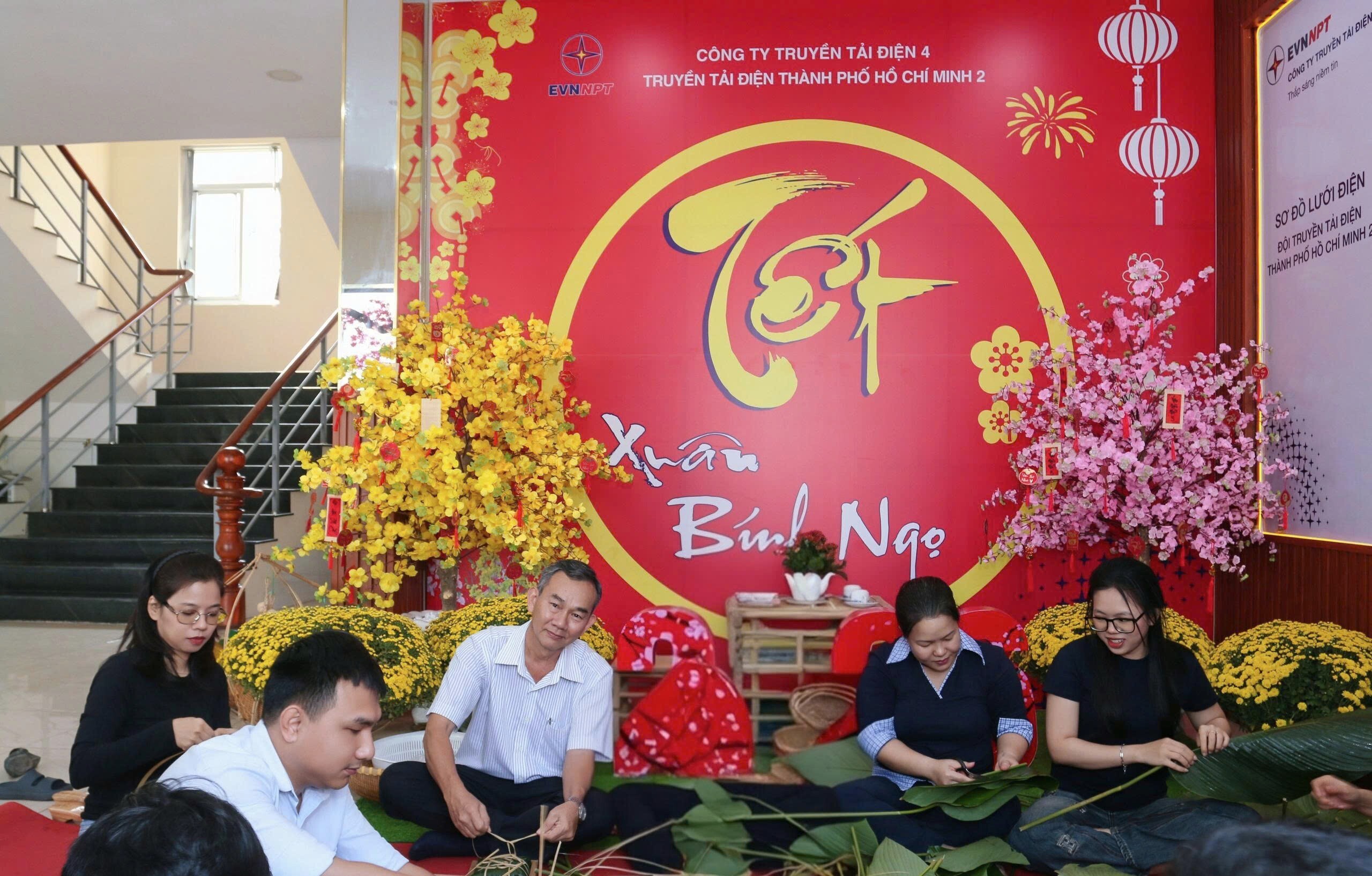 Cán bộ, công nhân viên Công đoàn Cơ quan Đội Truyền tải điện Thành phố Hồ Chí Minh 2 cùng nhau gói bánh chưng trong không khí rộn ràng, ấm áp tại trụ sở Đội.