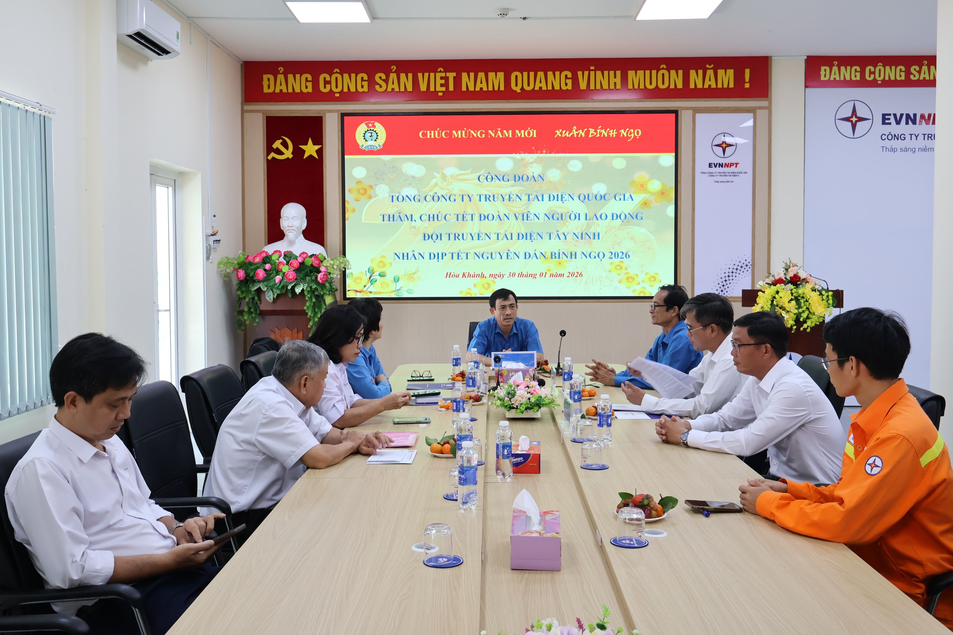 Tham gia đoàn công tác có ông Nguyễn Huy Thắng – Chủ tịch Công đoàn EVNNPT; ông Nguyễn Phương Nam – Chủ tịch Công đoàn Công ty Truyền tải điện 4. Tiếp và làm việc với đoàn có ông Nguyễn Trọng Hùng – Chủ tịch Công đoàn Đội Truyền tải điện Tây Ninh, cùng đoàn viên công đoàn cơ quan Đội Truyền tải điện Tây Ninh và Trạm biến áp 500kV Đức Hòa.
