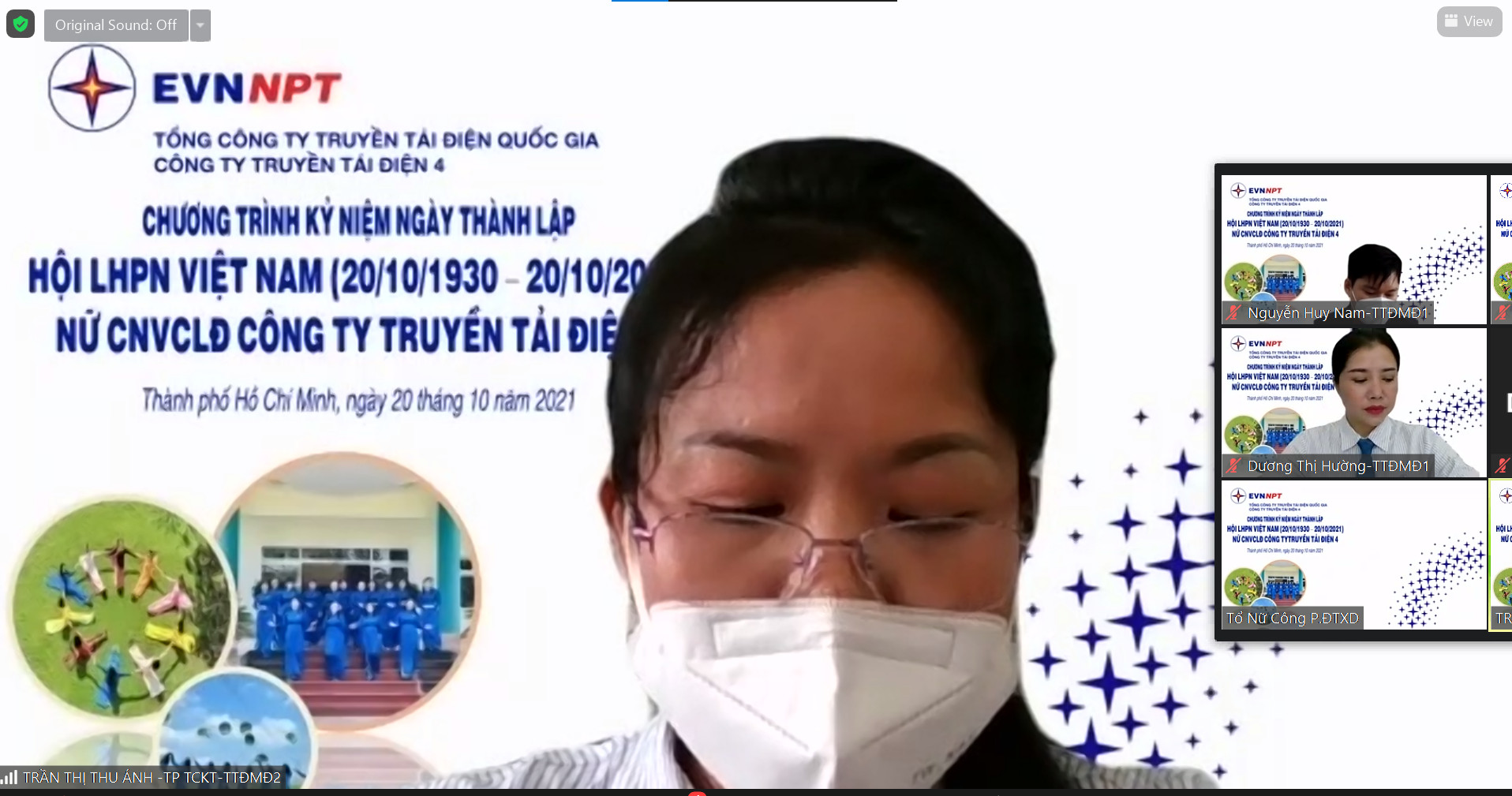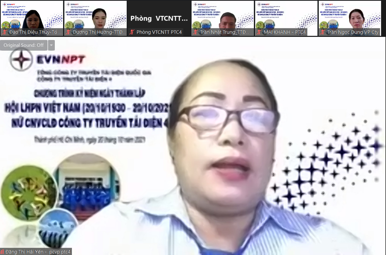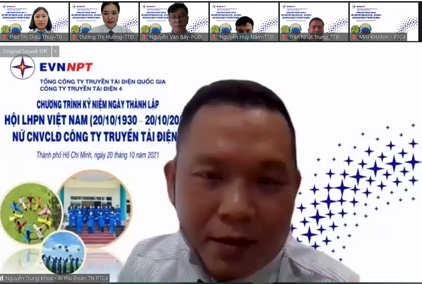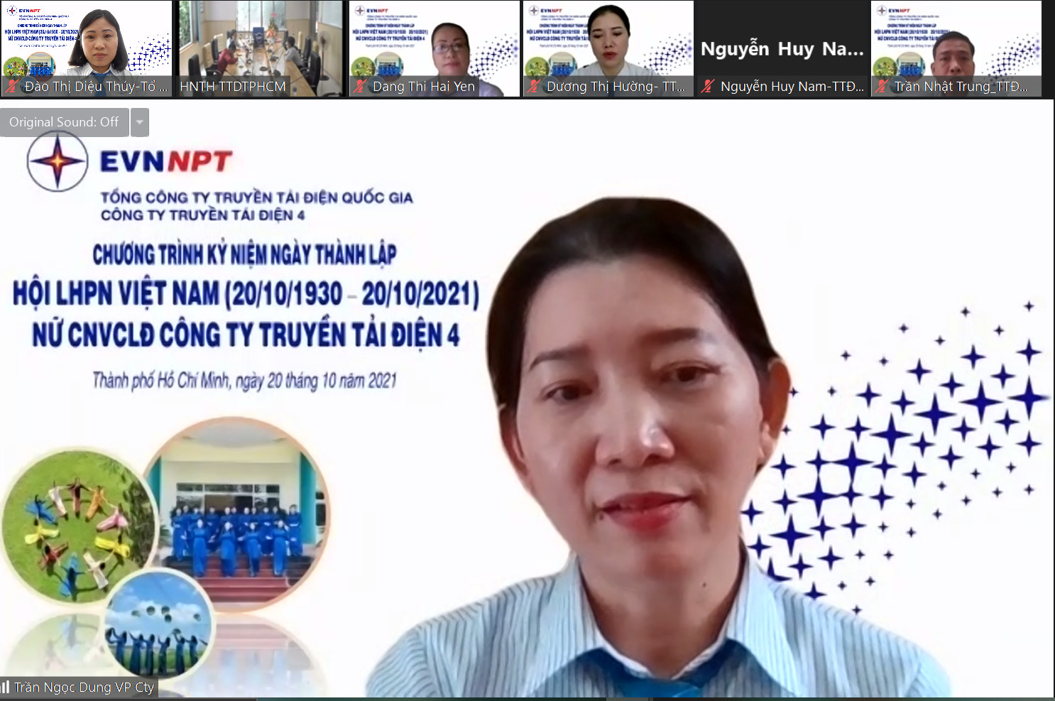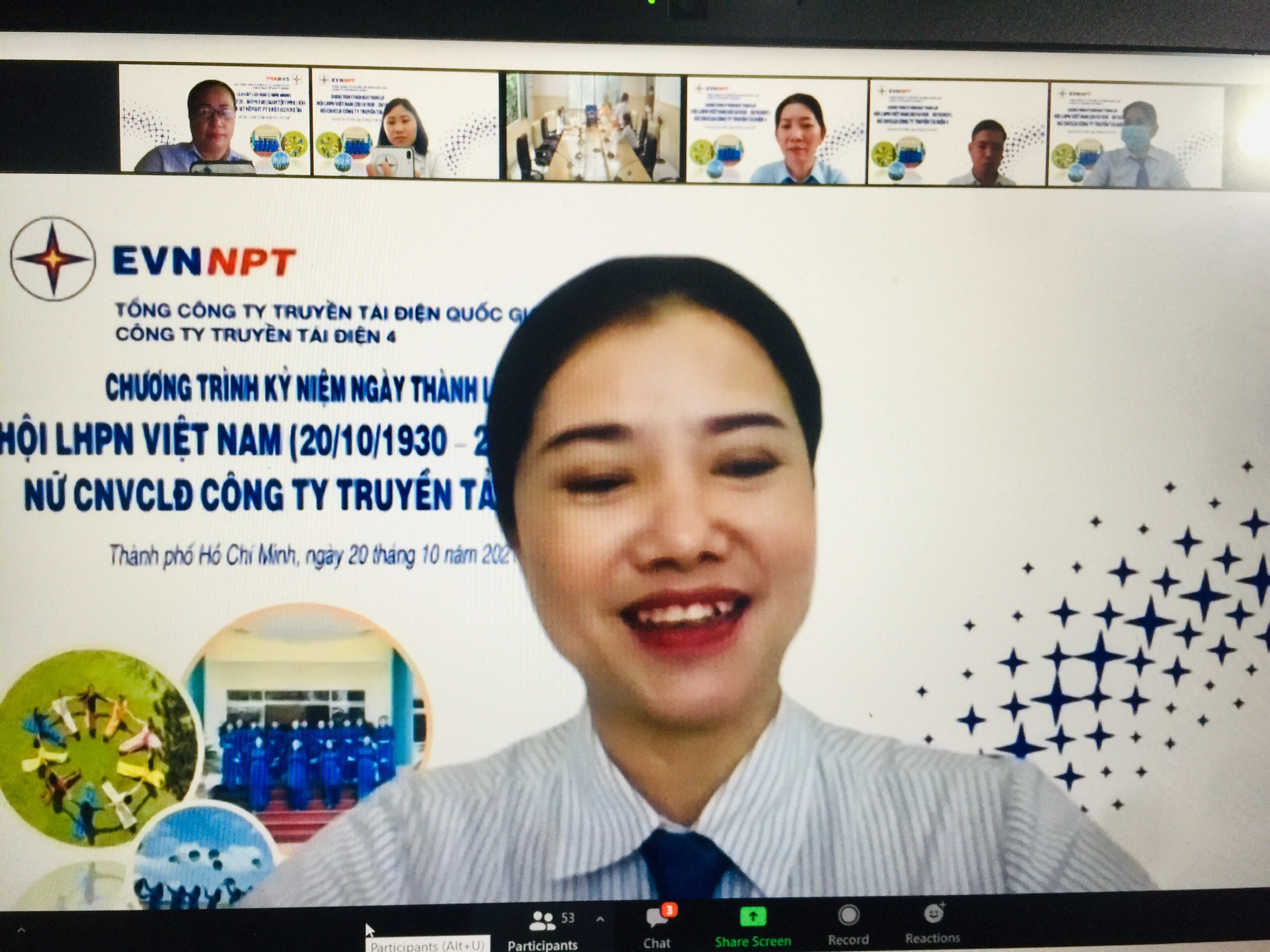Sáng ngày 20/10/2021 Ban nữ công quần chúng Công ty Truyền tải điện 4 tổ chức Chương trình kỷ niệm 91 năm ngày thành lập Hội Liên hiệp Phụ nữ Việt Nam (HLHPNVN). Tham dự chương trình có Ông Nguyễn Phương Nam – Chủ tịch Công Đoàn Công ty, Ông Nguyễn Văn Bảy – Phó Giám Đốc , Trưởng ban VSTBPN Công ty, Ông Nguyễn Trung Khoa – Bí Thư Đoàn Thanh niên Công ty, các đồng chí là Chủ tịch, Phó Chủ tịch Công đoàn cơ sở và 68 Nữ CNVC Công tham dự trực tuyến qua zoom metting.