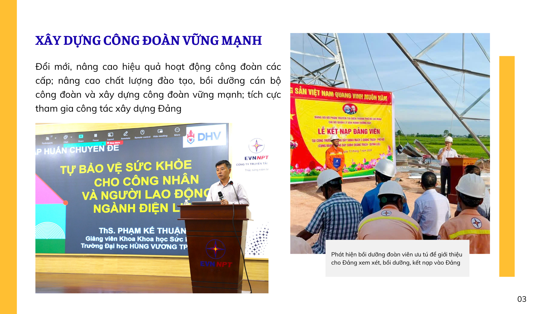 Toàn Công ty tổ chức Hội nghị Người lao động năm 2025 đúng tiến độ, thu nhận 60 ý kiến, giải đáp thỏa đáng tất cả các kiến nghị, đề xuất của người lao động. Công đoàn cũng đồng hành cùng chuyên môn tổ chức đối thoại định kỳ và đối thoại theo vụ việc về tiền lương, an toàn điện, chế độ cho lực lượng bị ảnh hưởng bởi sắp xếp tinh gọn tổ chức – góp phần ổn định tư tưởng người lao động.