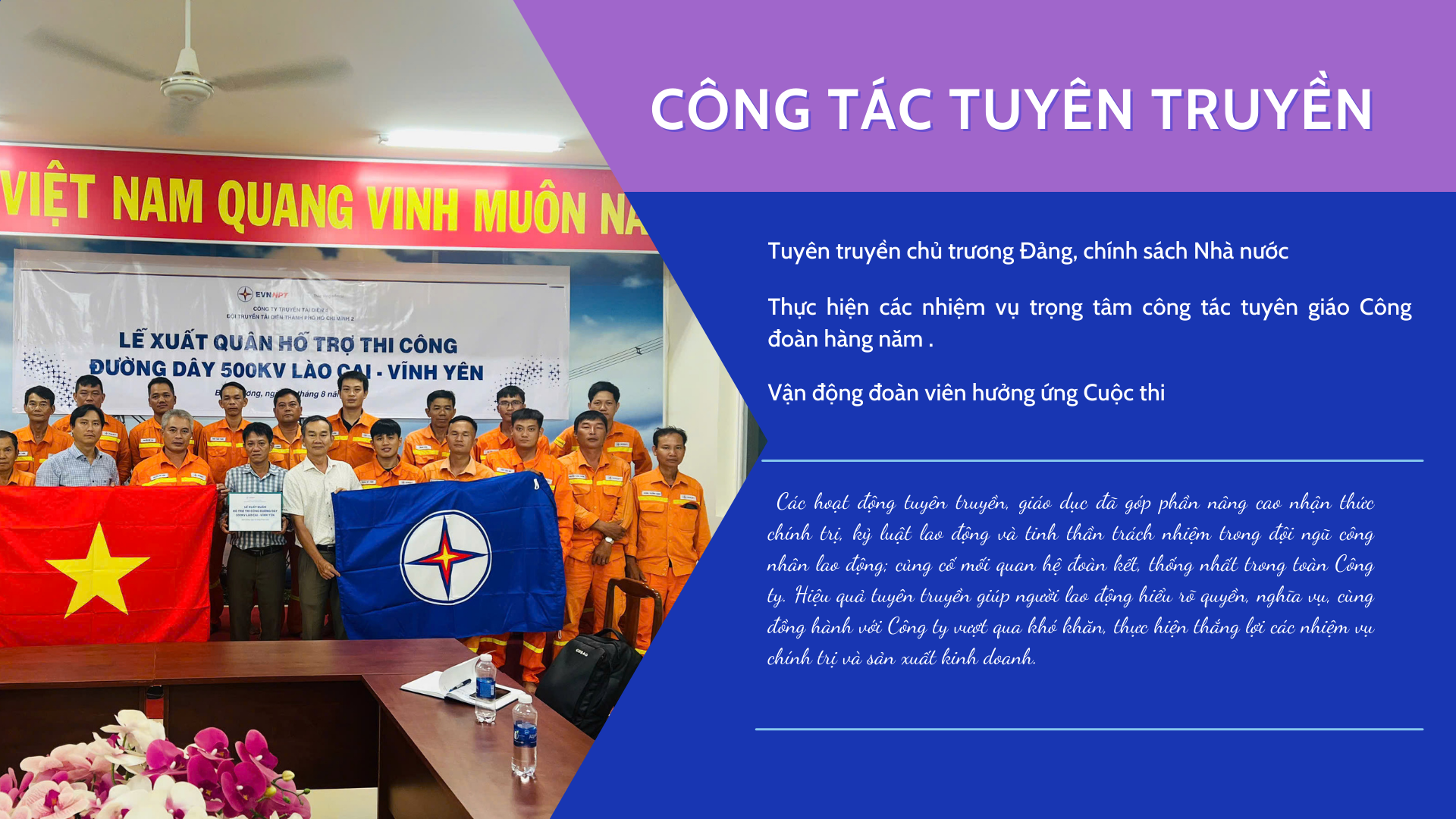 Công đoàn PTC4 triển khai tuyên truyền về ATVSLĐ, an toàn giao thông, vận hành mùa khô, hỗ trợ xây dựng Đường dây 110kV Vĩnh Châu – Côn Đảo, 500kV Lào Cai – Vĩnh Yên, học tập theo gương Bác, đấu tranh phản bác thông tin sai lệch… Đồng thời phổ biến rộng rãi chủ trương vận hành tập trung, định mức lao động mới, chuyển đổi số và các cuộc thi tuyên truyền toàn quốc.