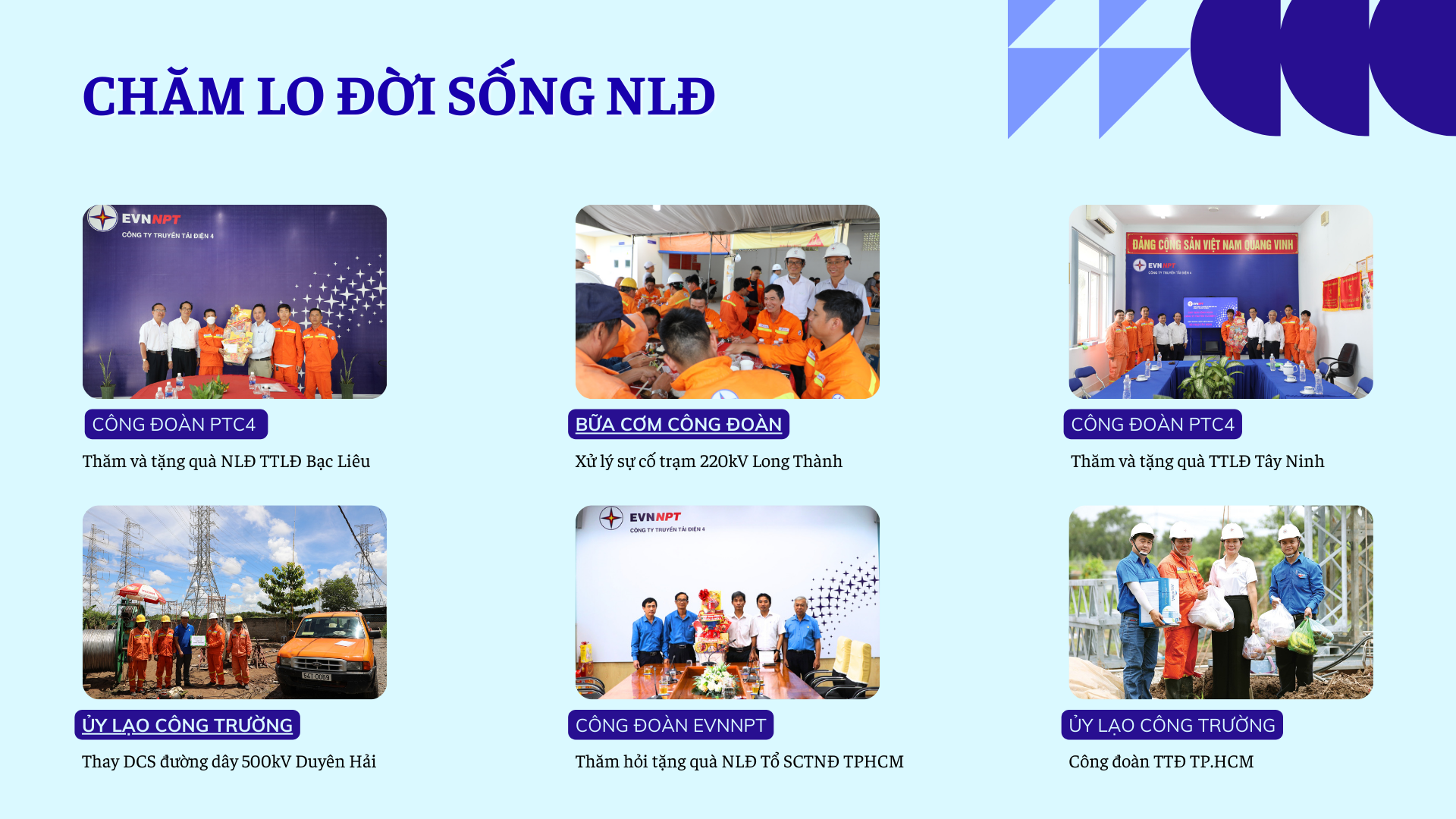 Mười hoạt động nổi bật kể trên đã tạo nên gam màu chủ đạo cho bức tranh Công đoàn PTC4 năm 2025: chủ động – đổi mới – nhân văn – chuyên nghiệp. Trong giai đoạn EVNNPT chuyển mình mạnh mẽ, tổ chức Công đoàn tiếp tục là điểm tựa của người lao động và là lực lượng đồng hành tin cậy của chuyên môn để hoàn thành nhiệm vụ truyền tải điện an toàn, ổn định, liên tục.