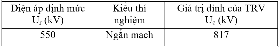 Dựa vào bảng báo cáo, giá trị TRV định mức của máy cắt khi thí nghiệm sự cố ngắn mạch là 817 kV. Nghĩa là theo tiêu chuẩn này thì chỉ thí nghiệm trong điều kiện vận hành xảy ra sự cố thì mới tìm được giá trị chịu đựng TRV định mức của máy cắt. Tiêu chuẩn này không quy định máy cắt hoạt động trong điều kiện vận hành bình thường (đóng cắt cuộn kháng bù ngang với dòng tải nhỏ) thì giá trị TRV chịu đựng là bao nhiêu.