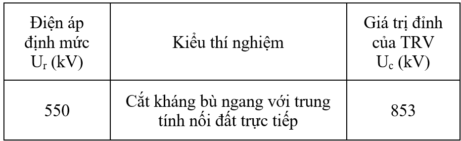 Bảng 4 liệt kê các giá trị TRV chịu đựng của máy cắt theo tiêu chuẩn IEC 62271-110 với điện áp định mức từ 100 kV đến 1200 kV dành cho cuộn kháng bù ngang có trung tính nối đất trực tiếp. Bảng liệt kê giá trị TRV theo tiêu chuẩn IEC 62271-110:2017 được trình bày chi tiết trong Bảng 4 [7].
