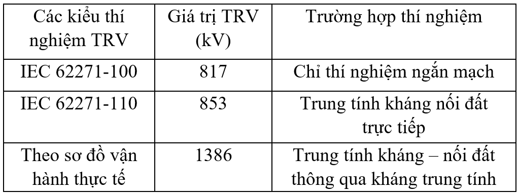 Bảng tổng hợp giá trị TRV chịu đựng của máy cắt theo tiêu chuẩn IEC 62271-110, IEC 62271-100 và theo sơ đồ vận hành thực tế như trong Bảng 5: