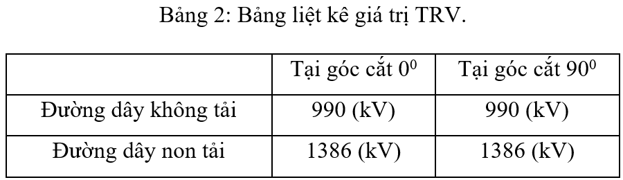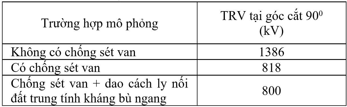 Sơ đồ vận hành theo khảo sát thực tế là cuộn kháng bù ngang có trung tính nối đất thông qua cuộn kháng trung tính và điện trở trung tính. Theo kết quả mô phỏng ở Bảng 2, trường hợp máy cắt khi cắt cuộn kháng bù ngang có trung tính nối đất thông qua cuộn kháng trung tính thì giá trị TRV lớn nhất xảy ra lúc cắt máy cắt tại góc cắt 900 khi đường dây non tải là 1386 kV.