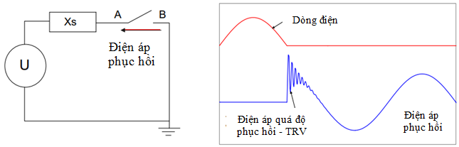 Điện áp phục hồi (Recovery Voltage - RV) trong máy cắt là điện áp xuất hiện giữa hai đầu cực của máy cắt xảy ra khi mở máy cắt như trong Hình 3.