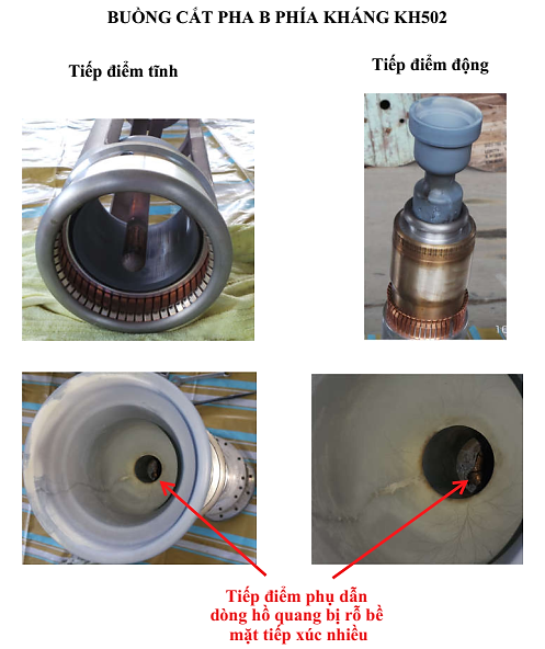 Hình 2.1. ghi nhận một số hình ảnh về sự ảnh hưởng của điện áp quá độ phục hồi TRV tác động lên máy cắt kháng, gây phóng điện bên trong tiếp điểm động của máy cắt kháng K502 pha B tại ngăn lộ kháng bù ngang KH502 trạm 500kV Ô Môn.