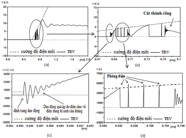 + Hình 4d: TRV vượt quá cường độ điện môi của máy cắt, phóng điện lặp lại diễn ra.