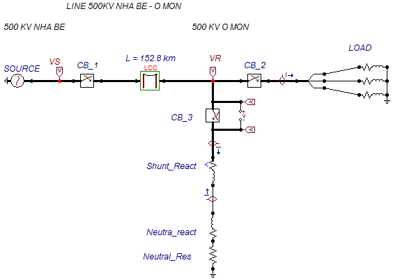 Đường dây trong mô hình mô phỏng có chiều dài thực tế là 152.83 km, thuộc loại đường dây có chiều dài trung bình và mô hình mạch π tương đương được sử dụng trong mô phỏng cho loại đường dây này. Đường dây thực tế trong Hình 6 được mô hình hóa bằng ATP như trong Hình 7.