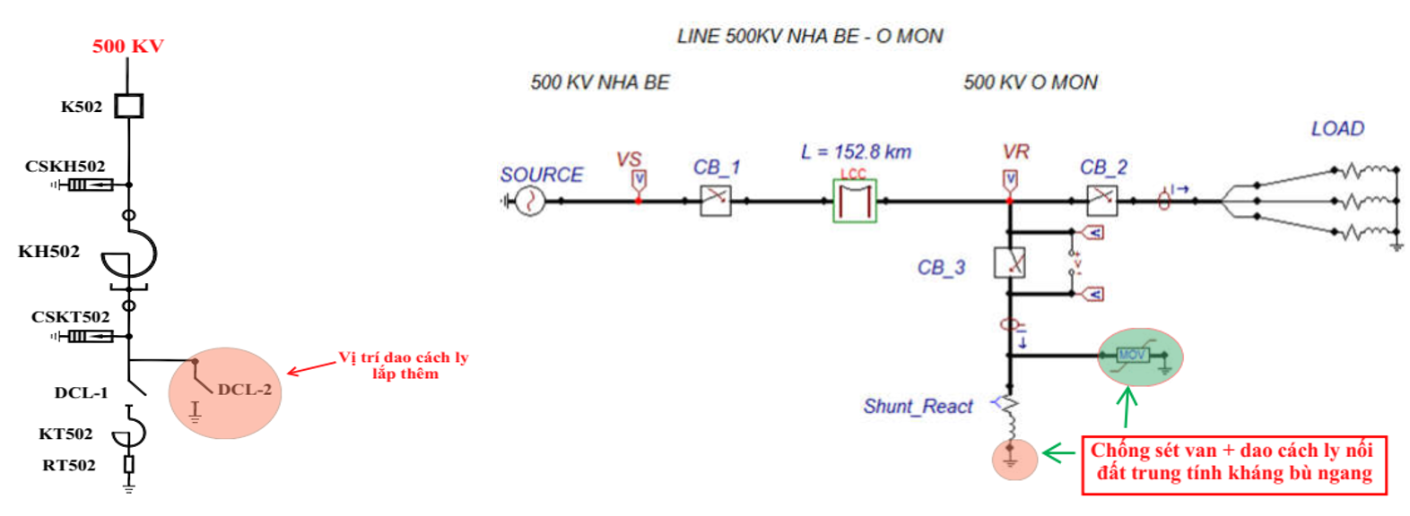 Theo sơ đồ đang vận hành thực tế tại ngăn kháng bù ngang 128 Mvar tại trạm biến áp 500kV Ô Môn có lắp đặt chống sét van 03 pha rời, đặt giữa máy cắt K502 và kháng bù ngang KH502 như Hình 9:
