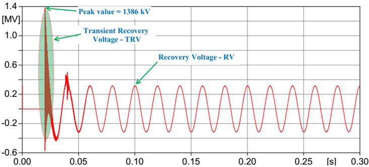 Hình 3: Điện áp quá độ phục hồi TRV xảy ra giữa 02 tiếp điểm của máy cắt.