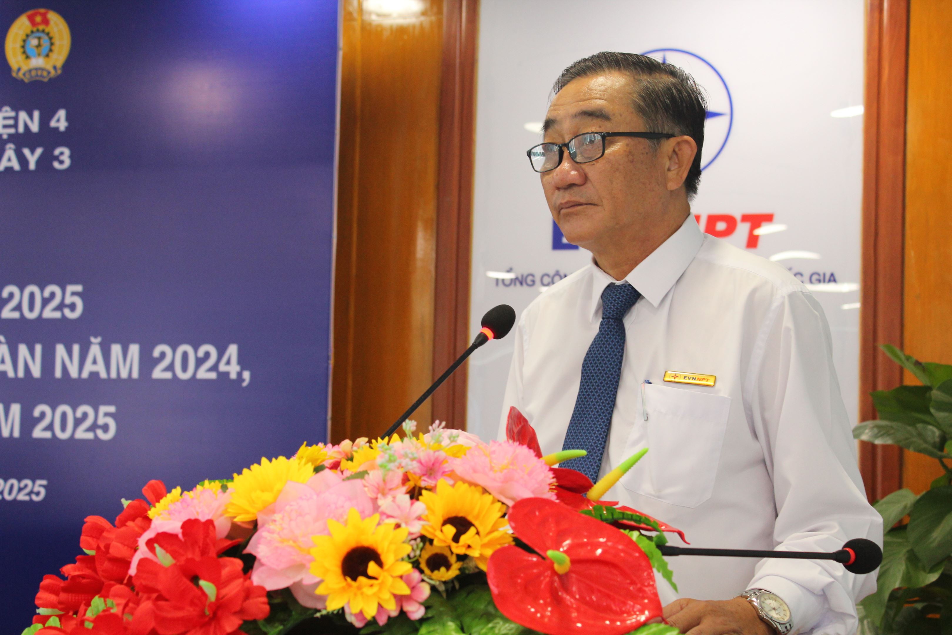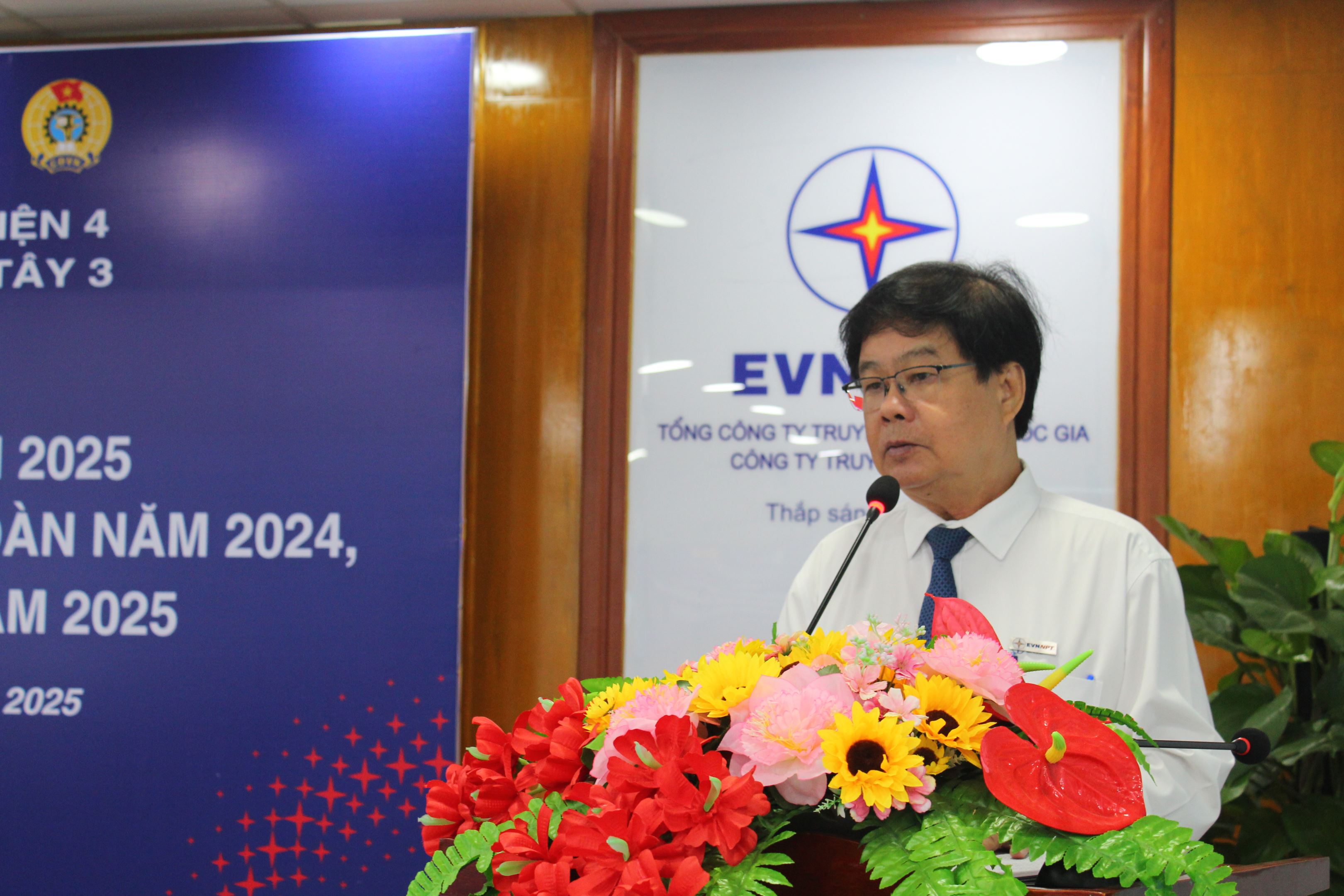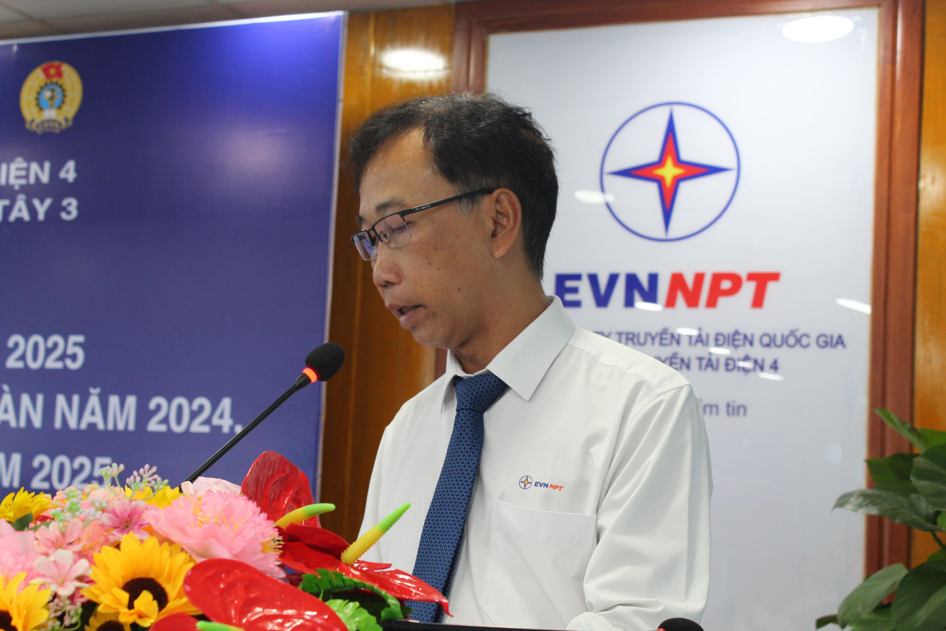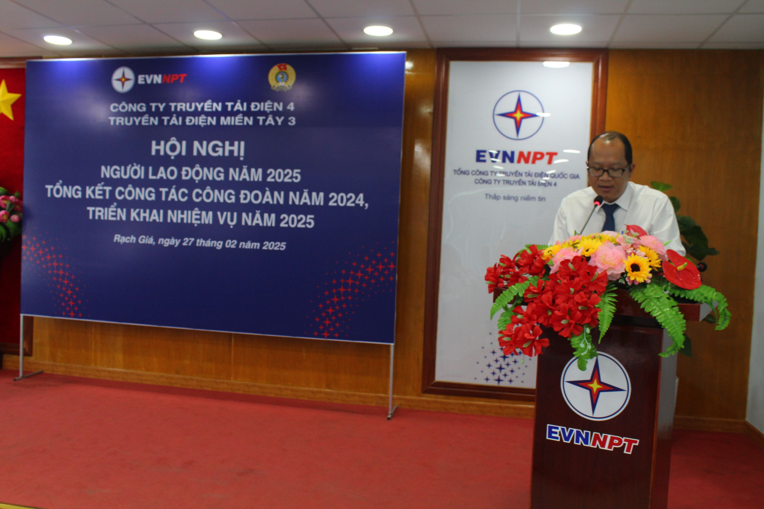 Phát biểu tại hội nghị, Ông Nguyễn Văn Lạc - UVBCH, cán bộ Công đoàn chuyên trách Công ty Truyền tải điện 4 chúc mừng các thành quả đạt được của Truyền tải điện miền Tây 3 trong năm qua, đề nghị đơn vị tiếp tục phát huy kết quả đạt được; thực hiện tốt vai trò mạng lưới an toàn vệ sinh viên, tuân thủ tuyệt đối an toàn trong lao động sản xuất; đẩy mạnh ứng dụng khoa học kỹ thuật và công nghệ vào hoạt động sản xuất kinh doanh theo chỉ đạo Công ty; Công đoàn Truyền tải điện miền Tây 3 phối hợp chuyên môn duy trì thực hiện công tác xanh - sạch - đẹp; thăm hỏi người thân của đoàn viên công đoàn, tích cực vận động, tuyên truyền người lao động tham gia giải đi bộ online năm 2025 đang diễn ra do Công đoàn Công ty tổ chức trong việc nâng cao đời sống tinh thần của người lao động; tạo điều kiện cho CNVCLĐ các đơn vị giao lưu, học tập, trao đổi kinh nghiệm, nâng cao chất lượng phong trào thể dục, thể thao, tăng cường sức khỏe, tái tạo sức lao động, phát huy tinh thần đoàn kết của CNVCLĐ các đơn vị trong Công ty. Ông Nguyễn Văn Lạc cũng bày tỏ sự tin tưởng rằng Truyền tải điện miền Tây 3 tiếp tục giữ vững các kết quả đã đạt được trong năm qua, hoàn thành xuất sắc nhiệm vụ được giao, gặt hái được nhiều thành công trong năm 2025.