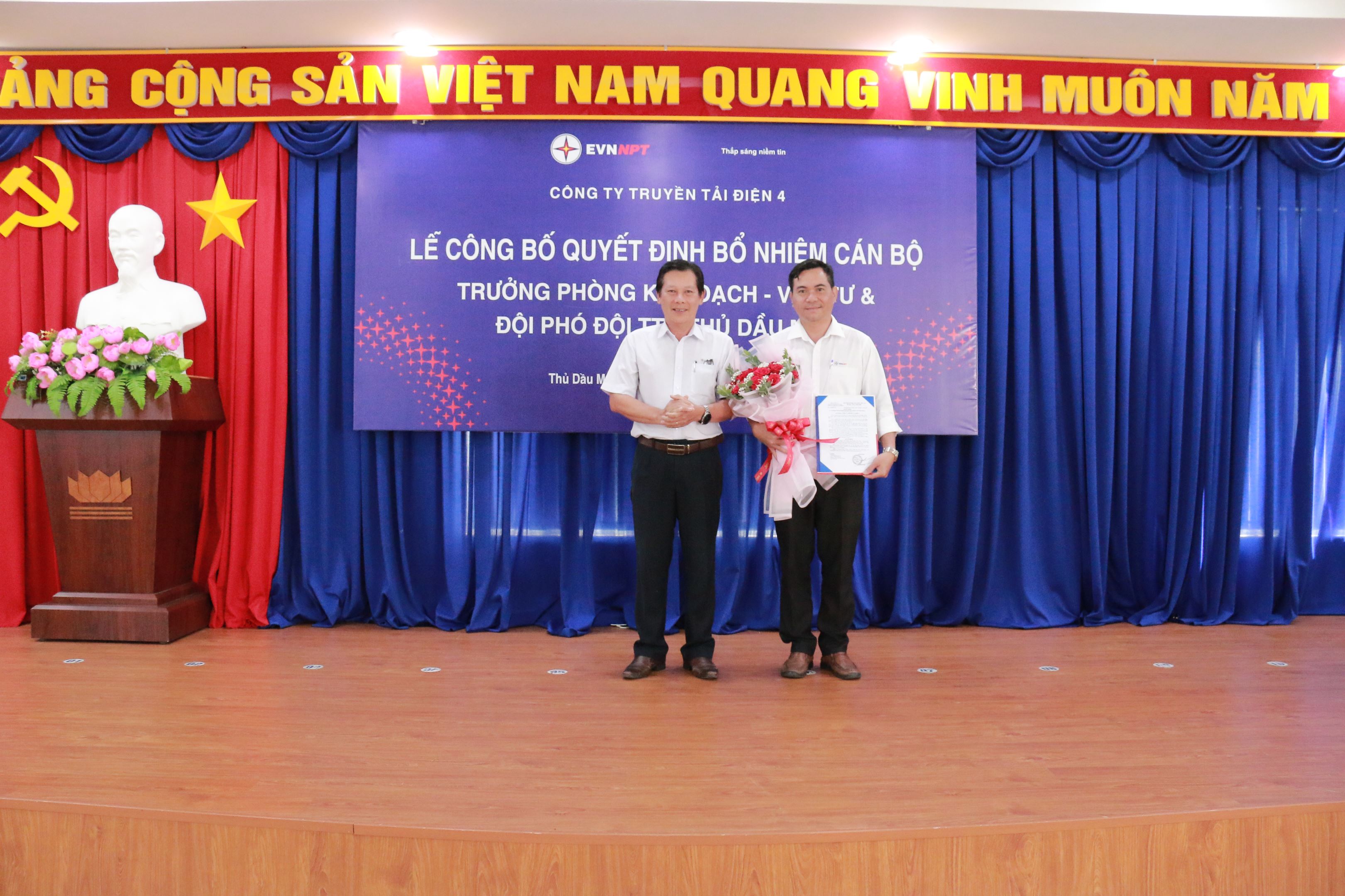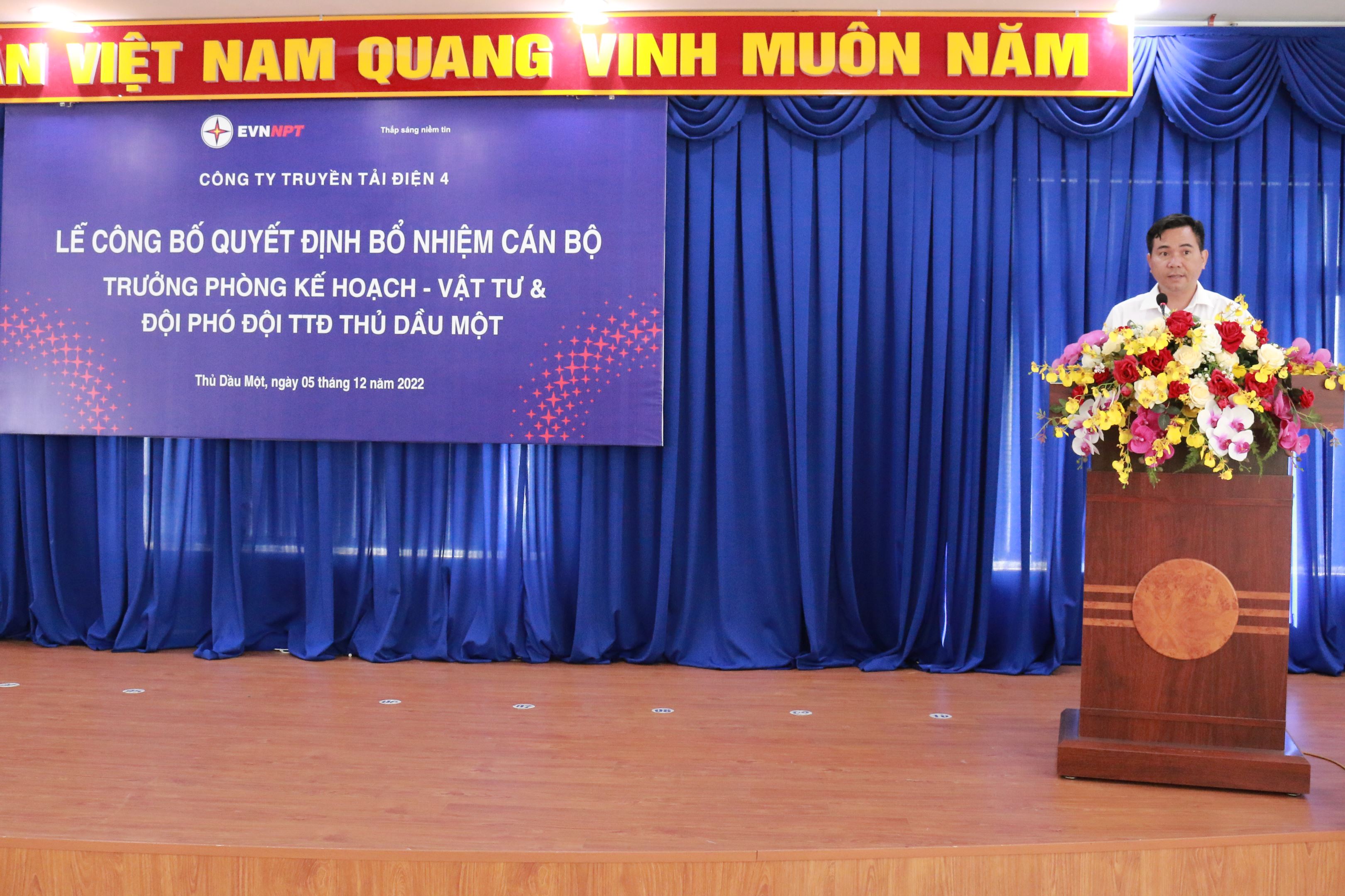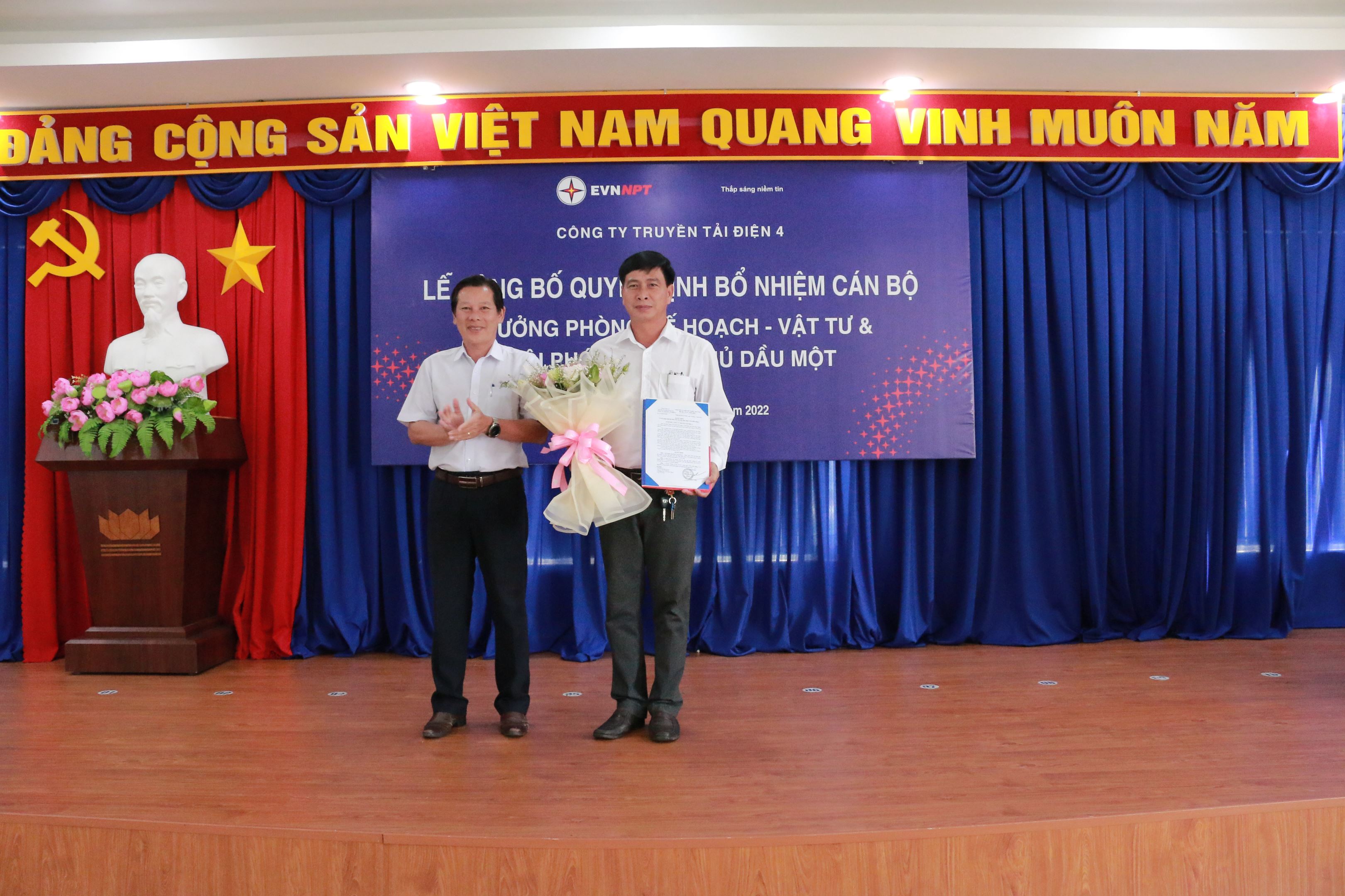 Tại buổi lễ, ông Đào Viết Trường –Trưởng phòng Tổng hợp đã công bố Quyết định số 8716/QĐ-PTC4 ngày 29/11/2022 bổ nhiệm ông Nguyễn Văn Tiến Trưởng trạn 500kV Tân Uyên giữ chức vụ Trưởng Phòng Kế hoạch - Vật tư thuộc TTĐ miền Đông 2 kể từ ngày 02/12/2022. Quyết định số 8718/QĐ-PTC4 ngày 29/11/2022 bổ nhiệm ông Phan Công Khiêm - cán bộ kỹ thuật giữ chức Đội phó Đội TTĐ Thủ Dầu Một thuộc TTĐ miền Đông 2 kể từ ngày 02/12/2022 thời hạn bổ nhiệm là 05 năm.