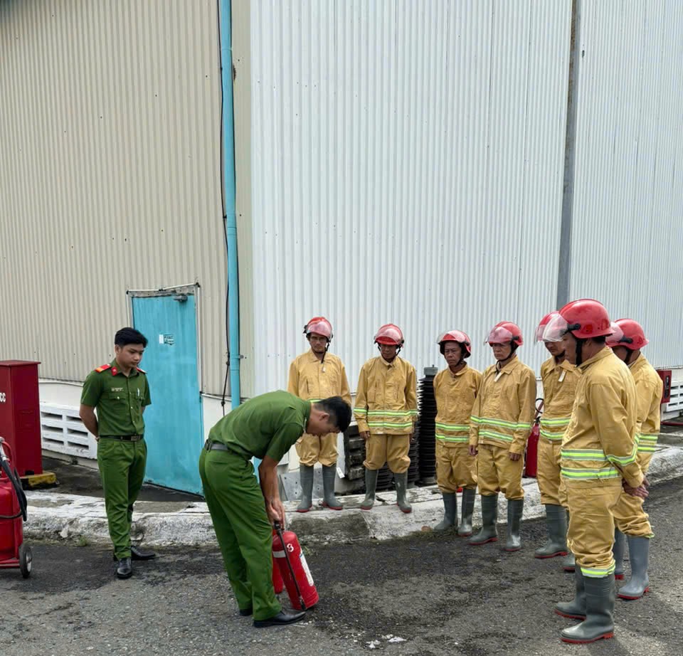 Chiến sĩ Công an PCCC tỉnh Đồng Nai - Phòng Cảnh sát PCCC & CNNH hướng dẫn Đội PCCC cơ sở sử dụng bình chữa cháy CO2