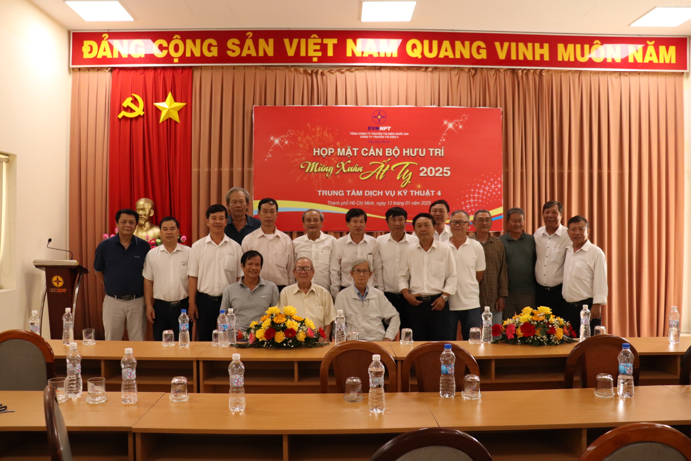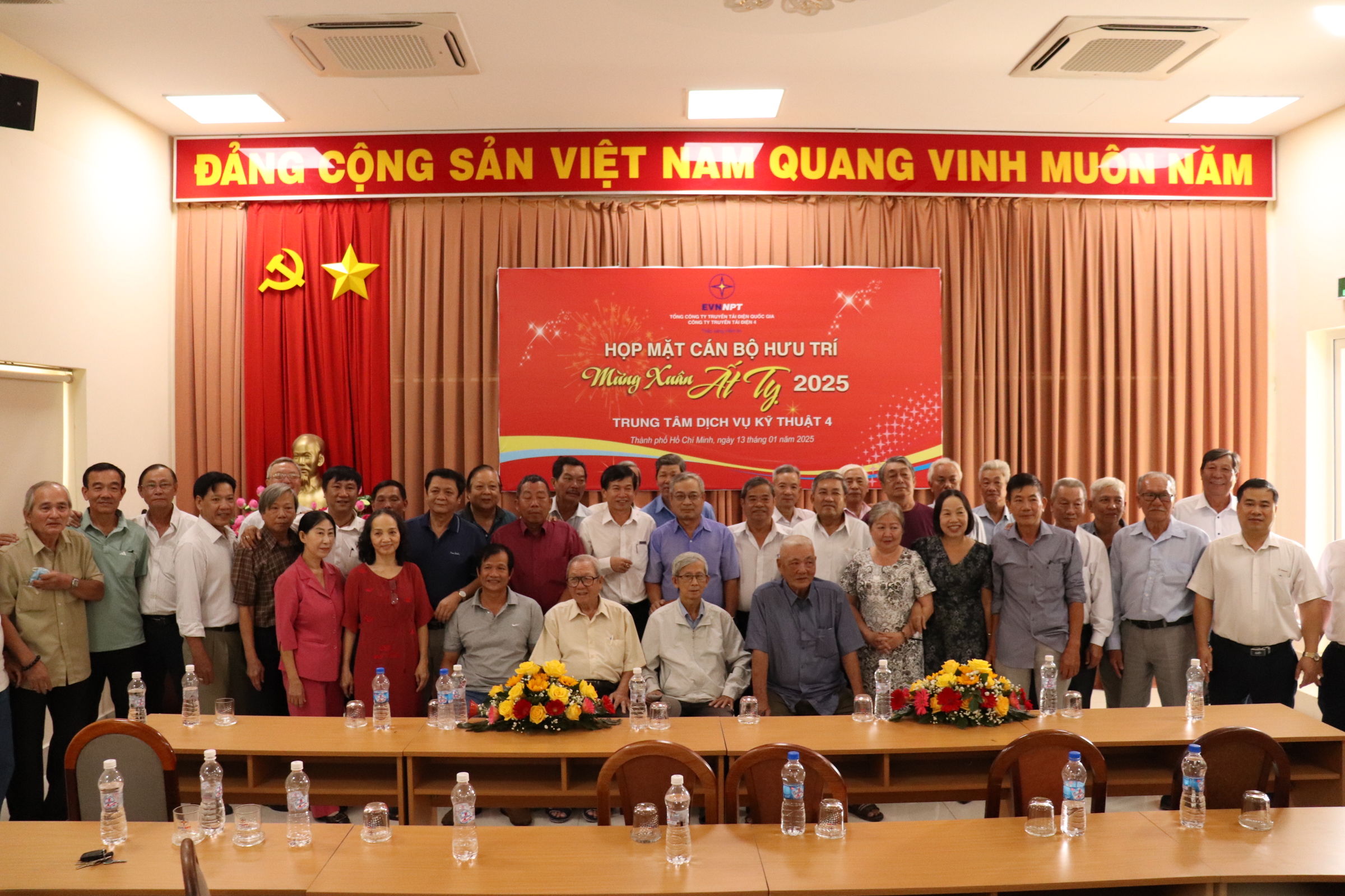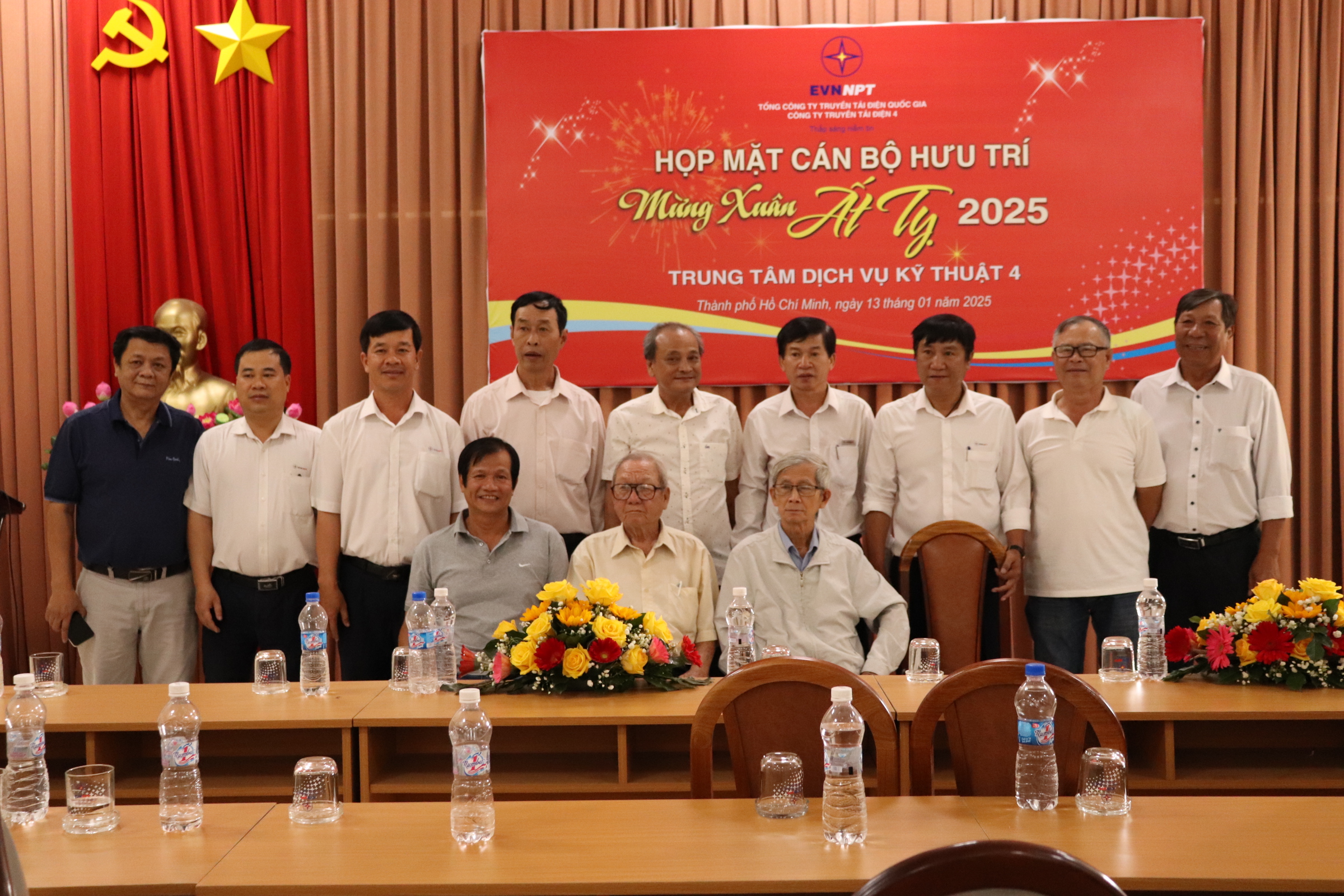 Thực hiện chủ trương của Công ty Truyền tải điện 4, sáng ngày 13.1.2025, Trung tâm Dịch vụ kỹ thuật 4 đã tổ chức chương trình gặp mặt các cán bộ hưu trí đã từng làm việc tại Trung tâm qua các thời kỳ nhân dịp đón chào Xuân Ất Tỵ 2025 tại Hội trường B - Số 07 Võ Nguyên Giáp, Phường Trường Thọ, TP Thủ Đức.