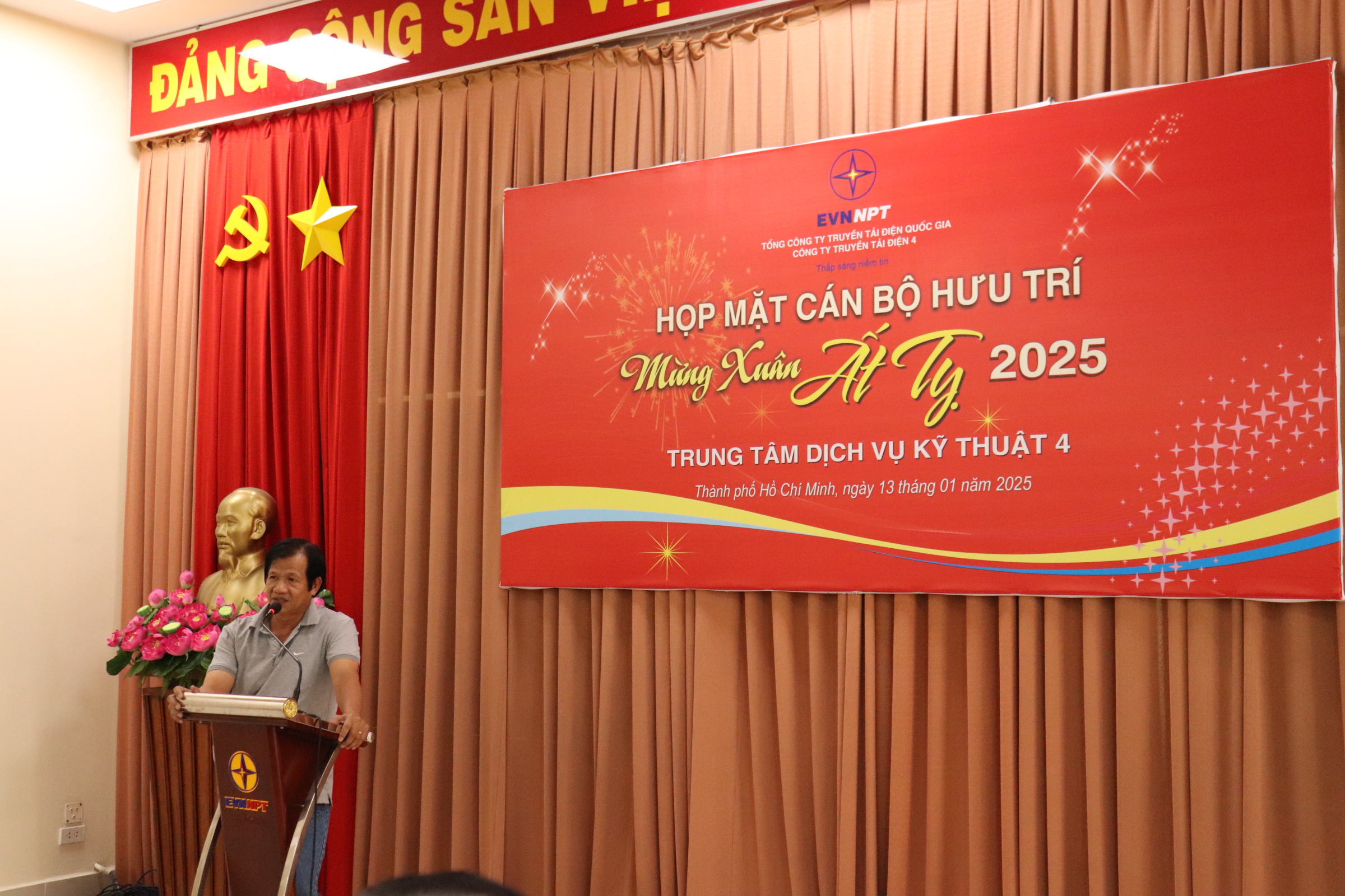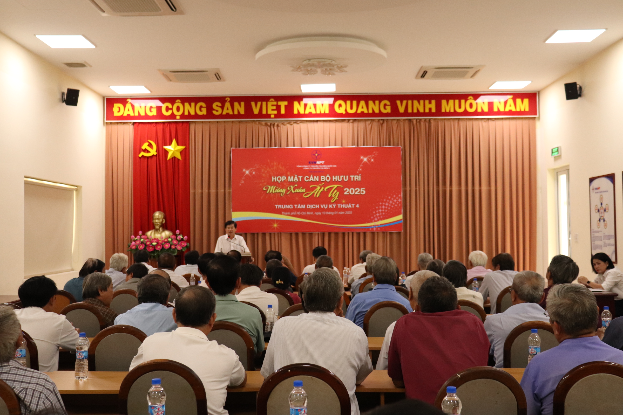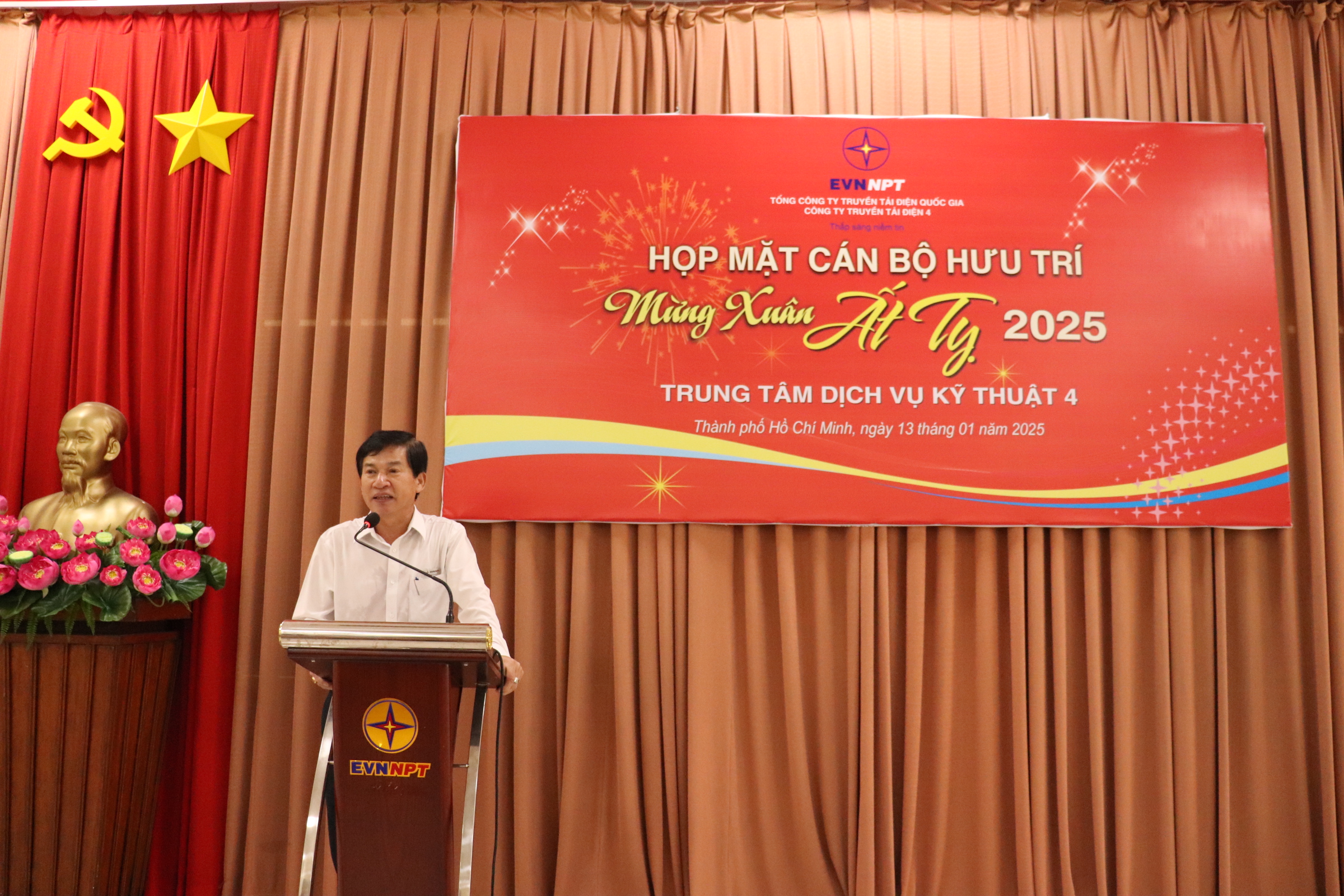Thực hiện chủ trương của Công ty Truyền tải điện 4, sáng ngày 13.1.2025, Trung tâm Dịch vụ kỹ thuật 4 đã tổ chức chương trình gặp mặt các cán bộ hưu trí đã từng làm việc tại Trung tâm qua các thời kỳ nhân dịp đón chào Xuân Ất Tỵ 2025 tại Hội trường B - Số 07 Võ Nguyên Giáp, Phường Trường Thọ, TP Thủ Đức.