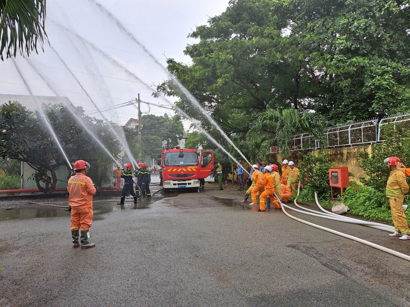Hình ảnh cán bộ, chiến sỹ Đội Chữa cháy và cứu nạn, cứu hộ Khu vực 5, phối hợp với Đội PCCC cơ sở trạm biến áp 500kV Nhà Bè thực hiện phương án chữa cháy.