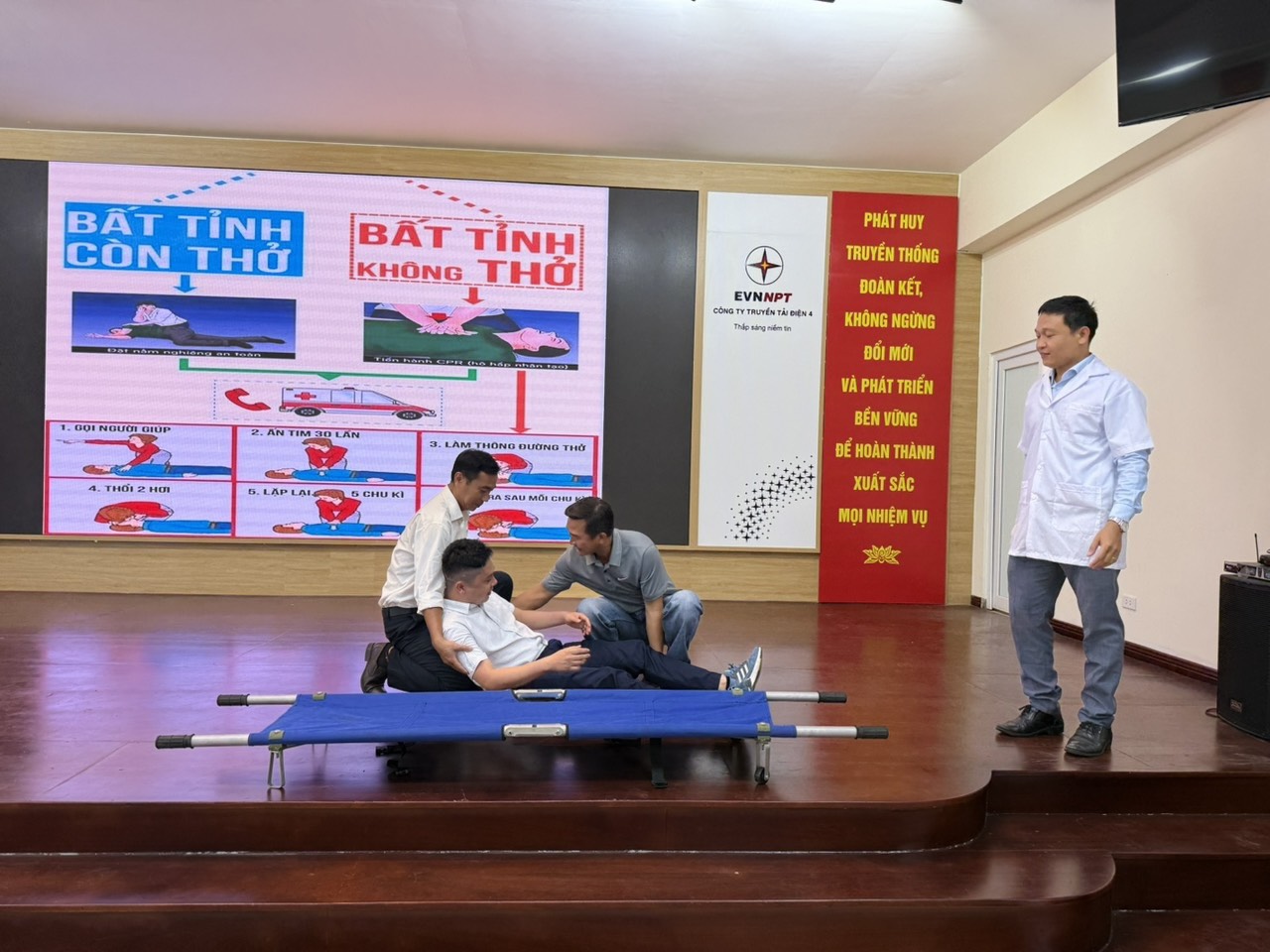 Giảng viên hướng dẫn thực hành về sơ cứu, cấp cứu tai nạn lao động cho CBCNV.