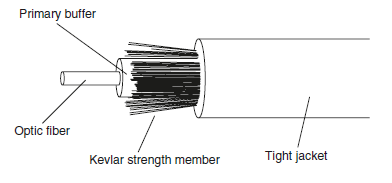 + Dạng đệm khít: Một ống đệm được bọc vừa khít với sợi quang để giảm đường kính lớp vỏ và gia tăng độ mềm dẻo. Tuy nhiên, sợi quang bị ảnh hưởng trực tiếp khi cáp bị kéo căng. Sợi quang có vỏ đệm khít thường được dùng lắp đặt trong nhà, làm dây nhảy đấu nối giữa các trạm đầu cuối. Hình 3.10 mô tả dạng ống đệm khít.