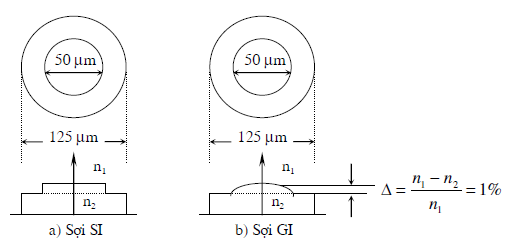 Đường kính lõi: d = 2a = 50 µm ¸ 10 µm, với a là bán kính lõi.