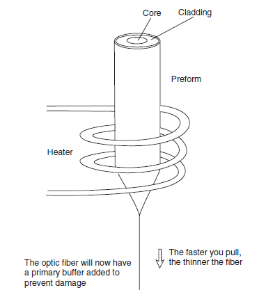 Giai đoạn 3: Lớp vỏ này sau đó được đặt lên tháp kéo và nhiệt độ được gia tăng lên khoảng 21000C. Không khí được giữ khô và sạch để tránh ô nhiễm. Sau đó sợi quang được kéo đừ đáy tháp và lớp vỏ, lõi chảy dọc theo điểm kéo. Nguồn laser được sử dụng để giám sát, điều chỉnh độ dày của sợi. Sau khi làm mát, cáp quang sẽ được quấn lại. Hình 3.6 mô tả tiến trình này.