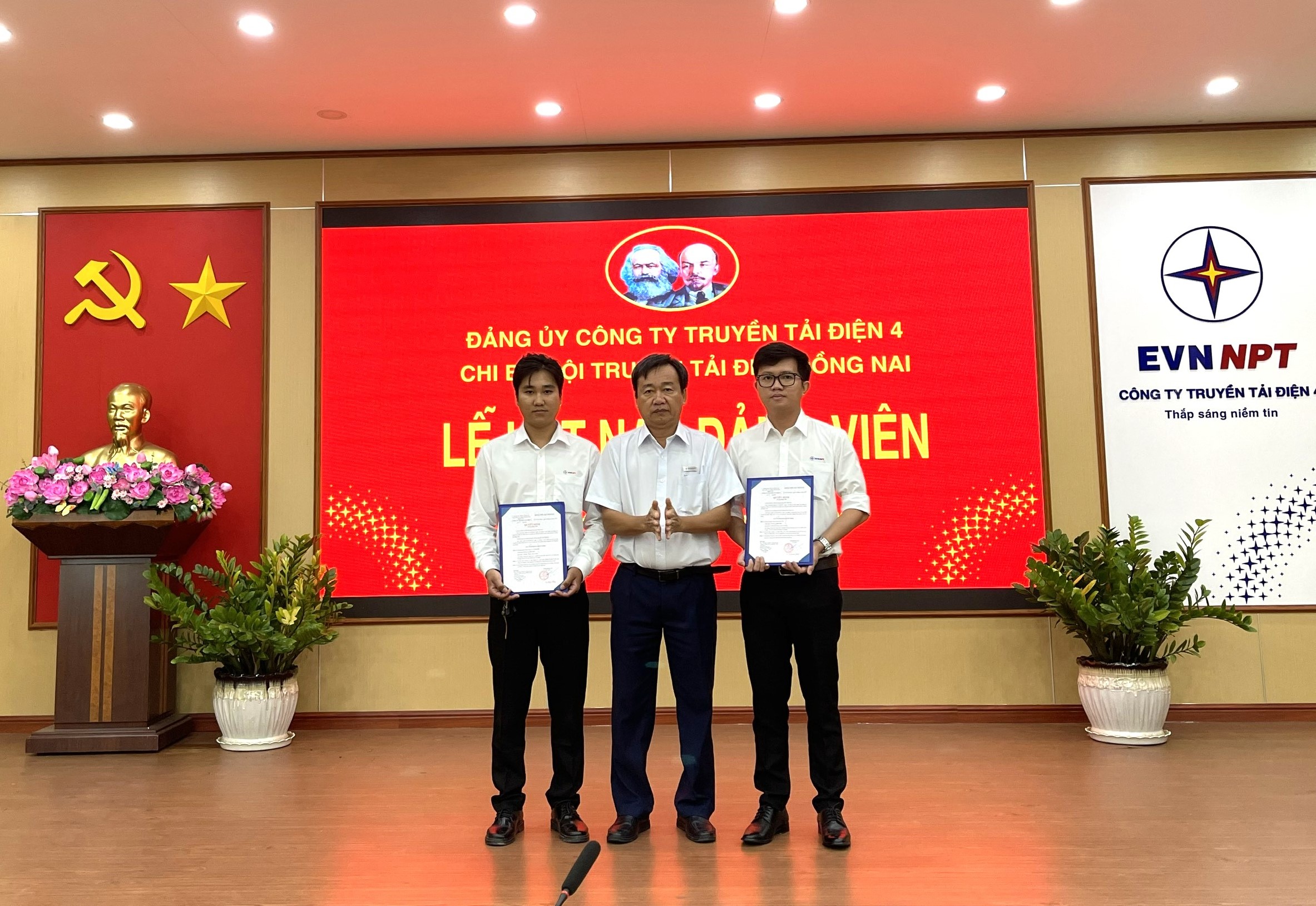 Đồng chí Nguyễn Minh Dũng - Bí thư Chi bộ Đội Truyền tải điện Đồng Nai trao Quyết định kết nạp Đảng cho 02 quần chúng Nguyễn Văn Nghiêm và Phan Quốc An