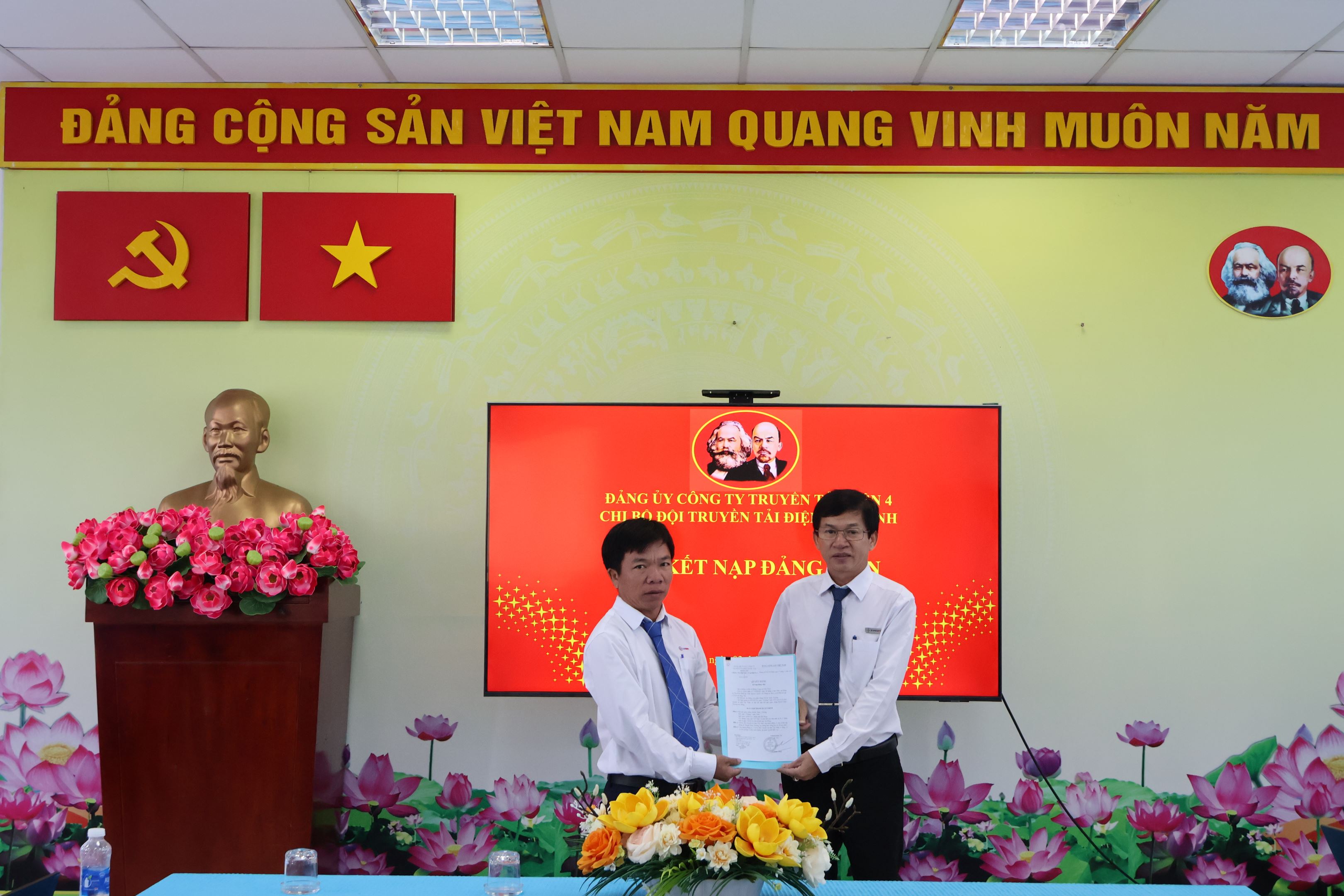 Đ/c Nguyễn Duy Trung - Bí thư chi bộ - Đội trưởng Đội Truyền tải điện Tây Ninh trao Quyết định kết nạp Đảng viên cho Đ/c Huỳnh Xuân Thương