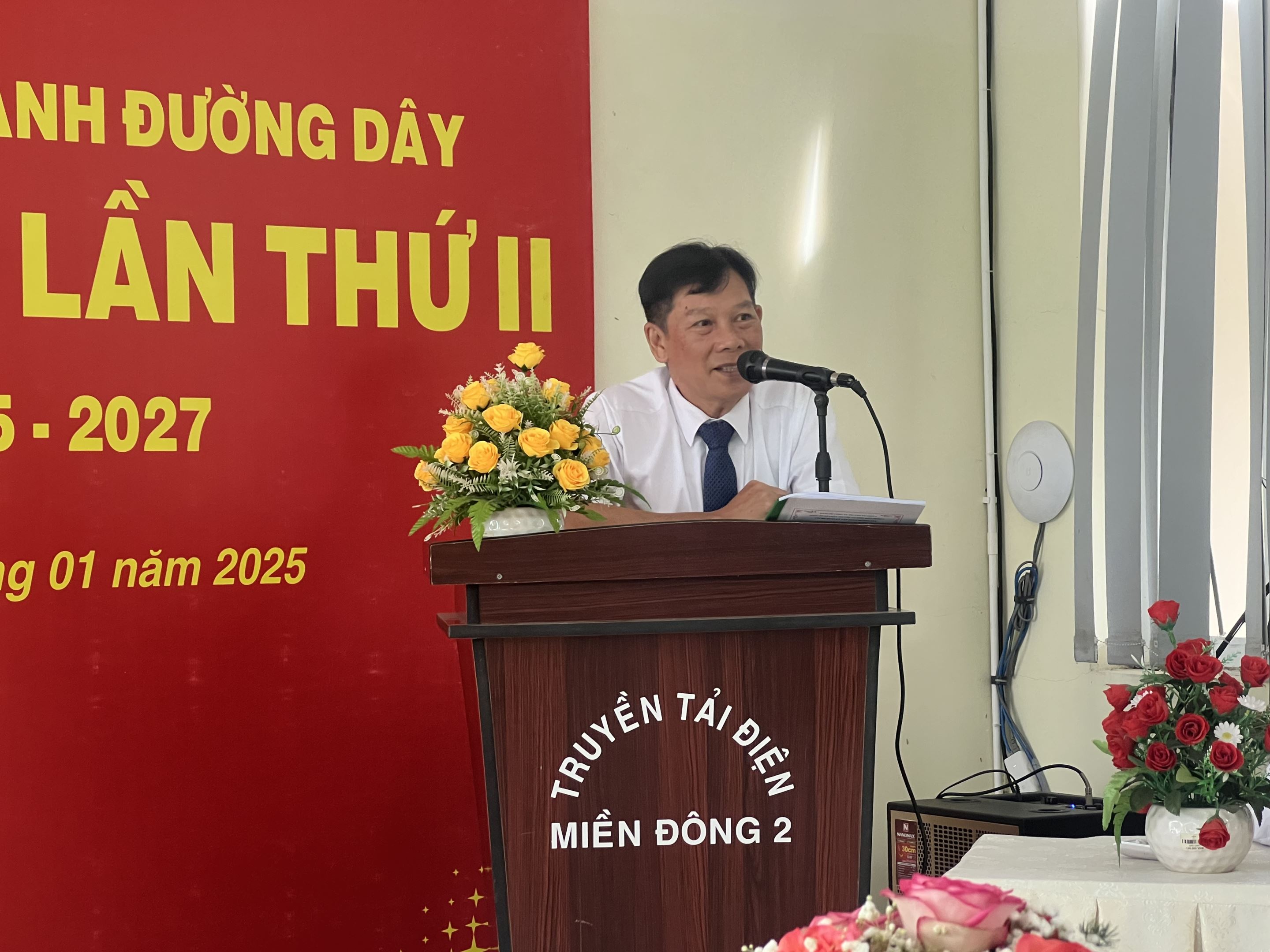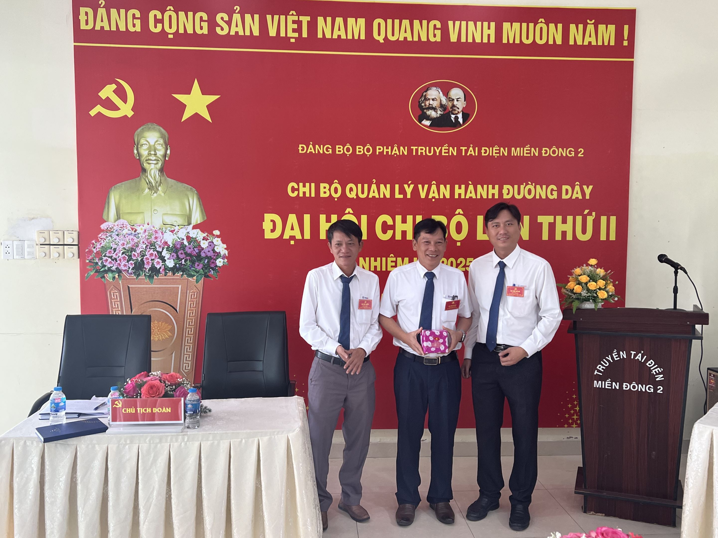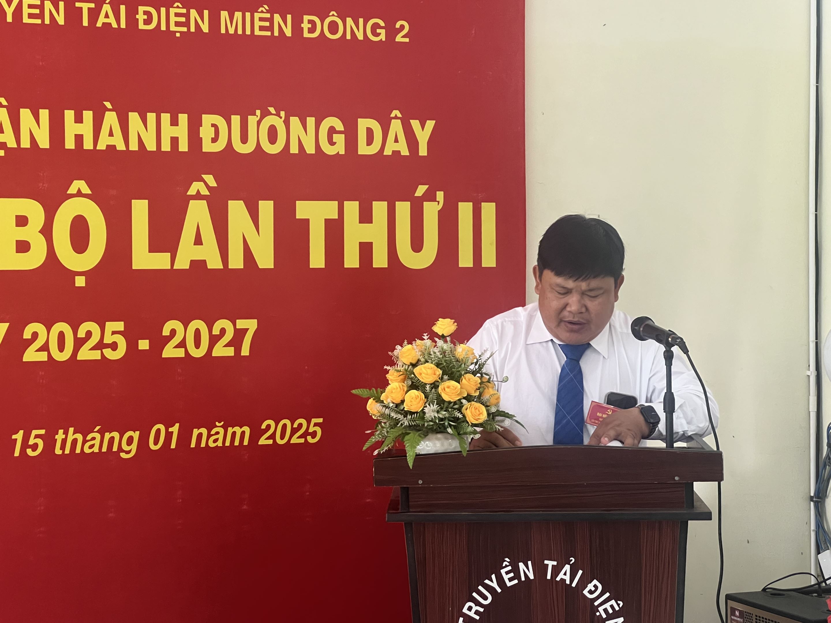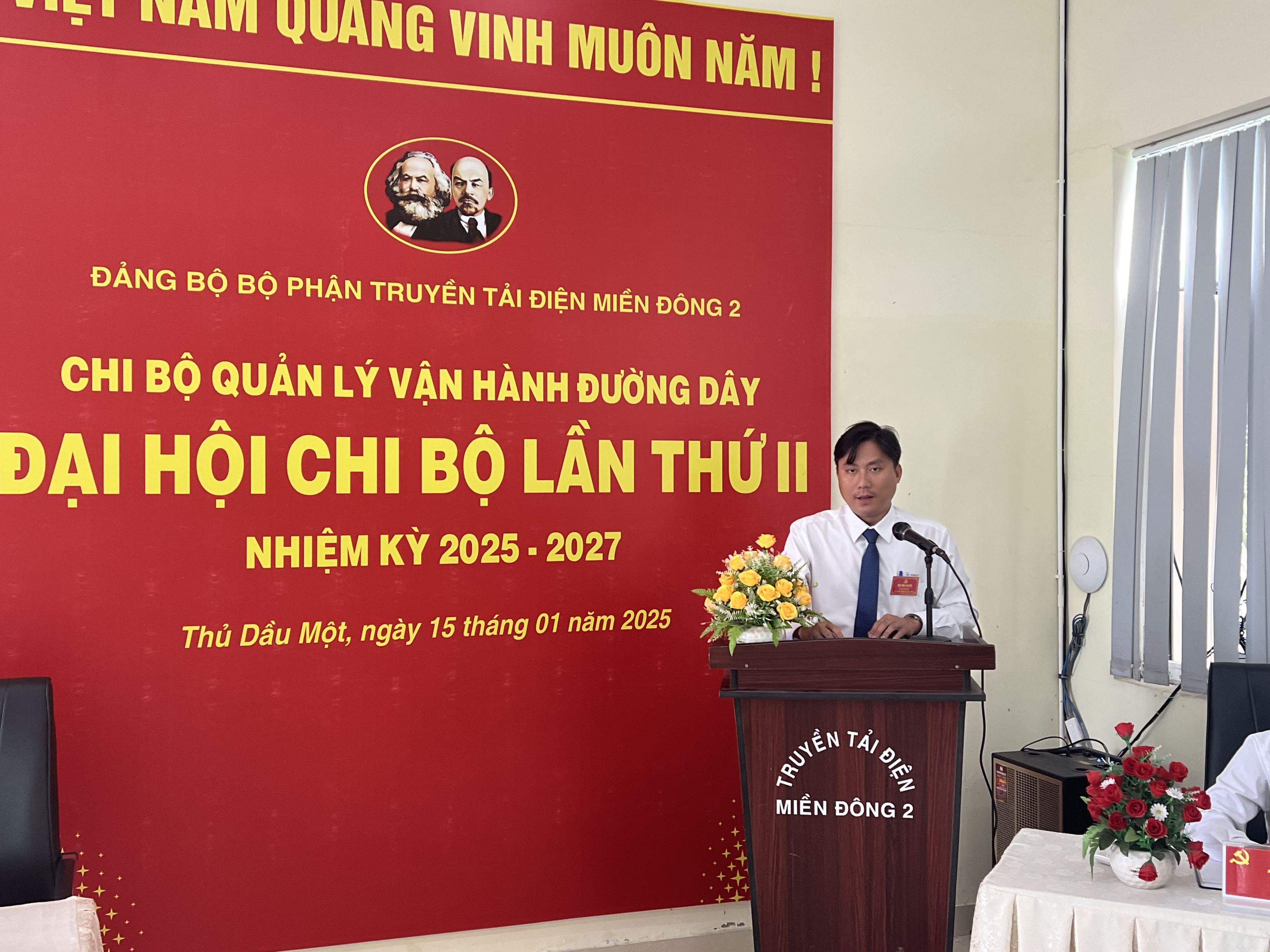 Đại hội cũng đã được tiếp thu các ý kiến chỉ đạo sâu sát của Đ/c Bùi Văn Hoàng - UVBTV Đảng ủy Công ty Truyền tải điện 4, Bí thư Đảng bộ bộ phận, Giám đốc Truyền tải điện miền Đông 2. Đ/c Hoàng cũng đã chúc mừng BCH chi bộ nhiệm kỳ 2022-2025 đã lãnh chỉ đạo thực hiện tốt các nhiệm vụ chính trị đặt ra. Ngoài ra, đồng chí cũng chỉ ra và phân tích một số yếu tố gây sự cố trong công tác QLVH Đường dây nhiệm kỳ qua. Quán triệt Chi bộ cần quan tâm chỉ đạo thực hiện việc xử lý cây trồng trong và ngoài hành lang khi Luật Điện lực mới được ban hành áp dụng (Luật số 61/2024-QH15 đã được Quốc hội thông qua). Đối với các sự cố do đứt dây / phụ kiện, cần có sự giám sát, kiểm tra ngay từ khi xây dựng dự án, để tránh tình trạng các khiếm khuyết không được phát hiện, tiềm ẩn nhiều nguy cơ trong quá trình vận hành cần xử lý trước khi đóng điện. Công tác chuyển đổi số hiện nay đang được Tổng công ty / Công ty đẩy mạnh ứng dụng vào sản xuất kinh doanh, các Phần mềm, thiết bị công nghệ đã được đưa vào khai thác, sử dụng như Phần mềm QLĐD, PMIS, CBM, HRMS, eSCL, eDocs, Doffice, kiểm tra đường dây, nhiệt độ mối nối bằng UAV, quản lý thông tin bản đồ GIS, hệ thống quan trắc sét.... Vì vậy, các đơn vị cần phổ biến đến toàn thể CBCNV biết, học tập từ các đơn vị đi trước, để tiến tới áp dụng 100% công tác QLKT trên phần mềm quản lý đường dây, góp phần tăng năng suất lao động. Chi bộ cần đưa vào mục tiêu, nhiệm vụ trong nhiệm kỳ 2025-2027 là 100% không xảy ra sự cố do cây vi phạm hành lang, sự cố do đứt dây, phấn đấu kết nạp mới 08 đảng viên trong nhiệm kỳ. Sau Đại hội, Chi bộ cần bắt tay ngay vào triển khai các nhiệm vụ trong Nghị quyết đã đề ra, đề ra các chương trình, kế hoạch hành động thực hiện Nghị quyết.