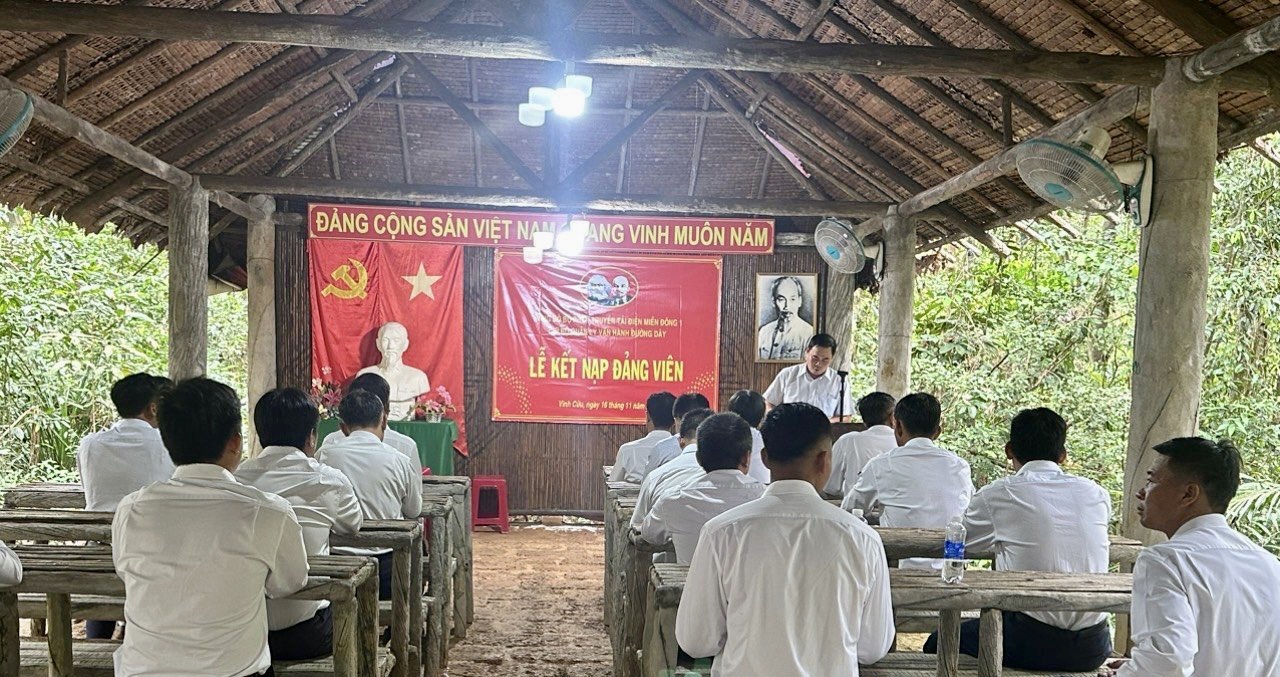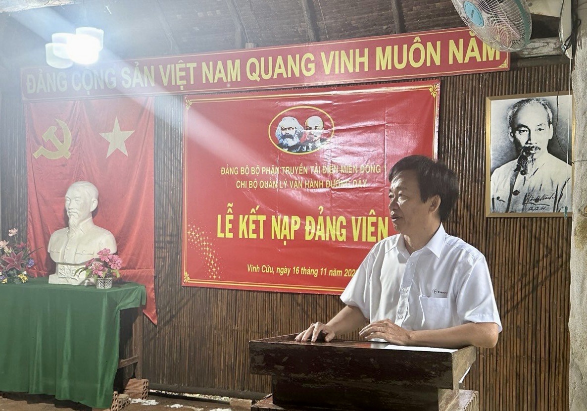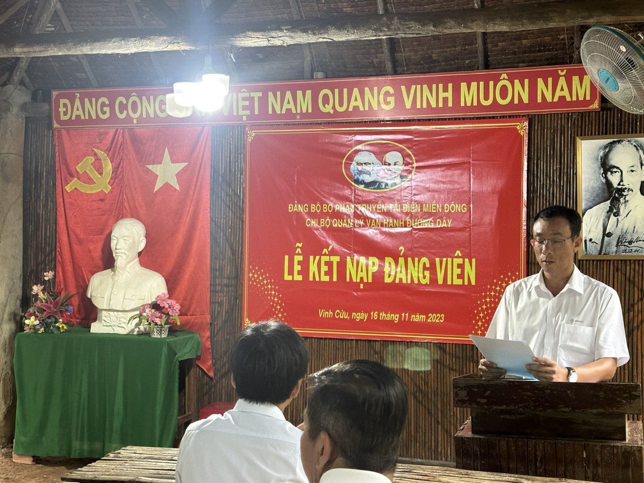 Buổi lễ kết nạp Đảng viên mới được diễn ra trong không khí trang nghiêm tại Hội trường khu di tích. Tham dự buổi lễ có đồng chí Nguyễn Minh Dũng - Bí thư Đảng bộ Bộ phận Truyền tải điện Miền Đông 1, các đồng trong BCH Đảng bộ Bộ phận, Đội trưởng các đội truyền tải điện và toàn thể các đảng viên đang sinh hoạt tại Chi bộ Quản lý vận hành đường dây. 03 quần chúng ưu tú được kết nạp Đảng lần này là đồng chí Đặng Hữu Sáng, đồng chí Nguyễn Đăng Tiến - tổ công nghệ Đội Nhơn Trạch và đồng chí Triệu Tiến Tình - cán bộ kỹ thuật Đội Truyền tải điện Định Quán. Tại buổi lễ, đồng chí Nguyễn Vỹ - Bí thư Chi bộ Quản lý vận hành đường dây đã chúc mừng các đồng chí đảng viên mới vinh dự được đứng trong hàng ngũ của Đảng và yêu cầu các đảng viên mới không ngừng bồi dưỡng kiến thức và kỹ năng chuyên môn, phát huy tính tiên phong gương mẫu của người đảng viên trên mọi lĩnh vực công tác, không ngừng nỗ lực trau dồi đạo đức, là tấm gương tiêu biểu trong mọi phong trào tại đơn vị.