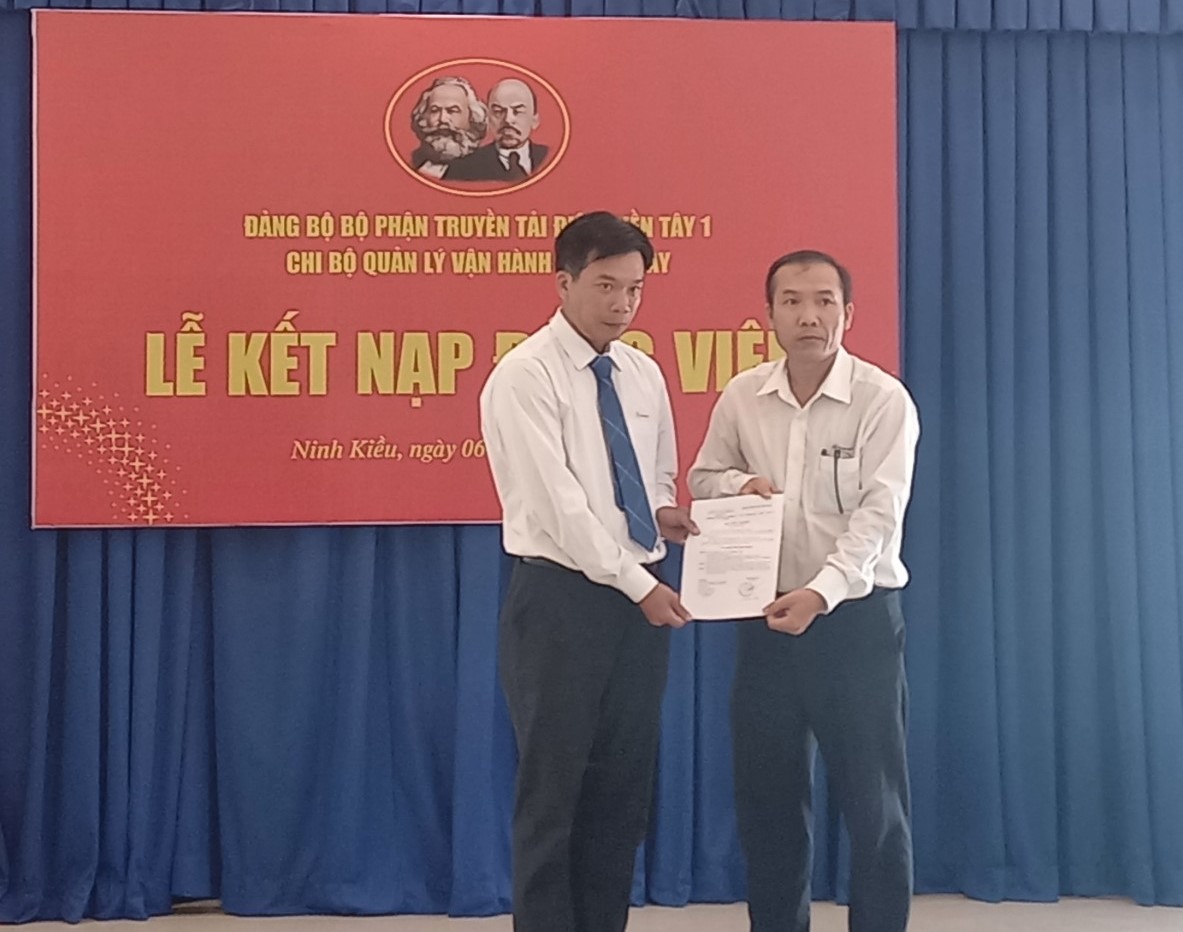 Đồng chi Phạm Ngọc Luật - Bí thư Chi bộ Quản lý vận hành đường dây (Đứng bên phải) trao quyết định kết nạp đảng cho đảng viên mới.