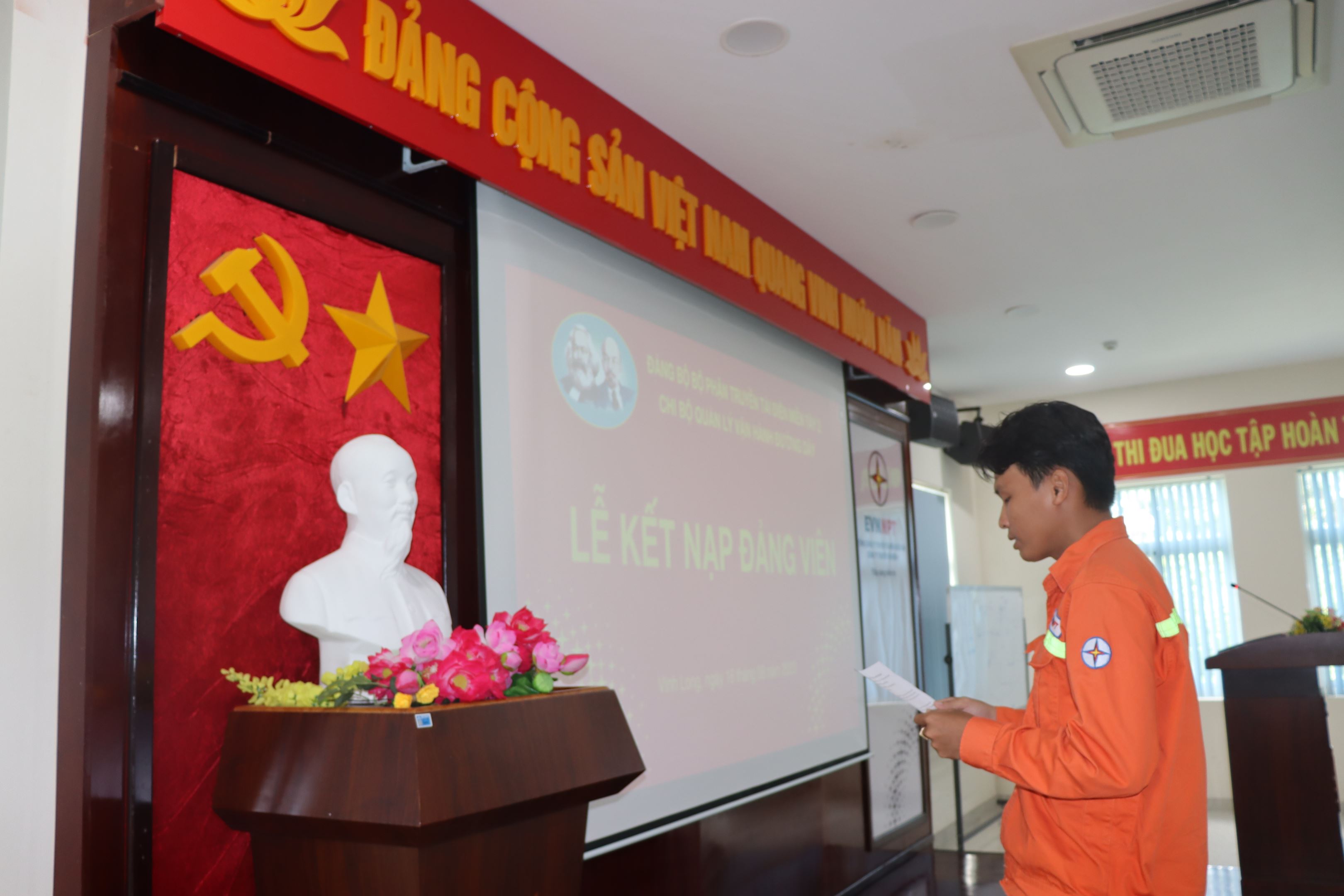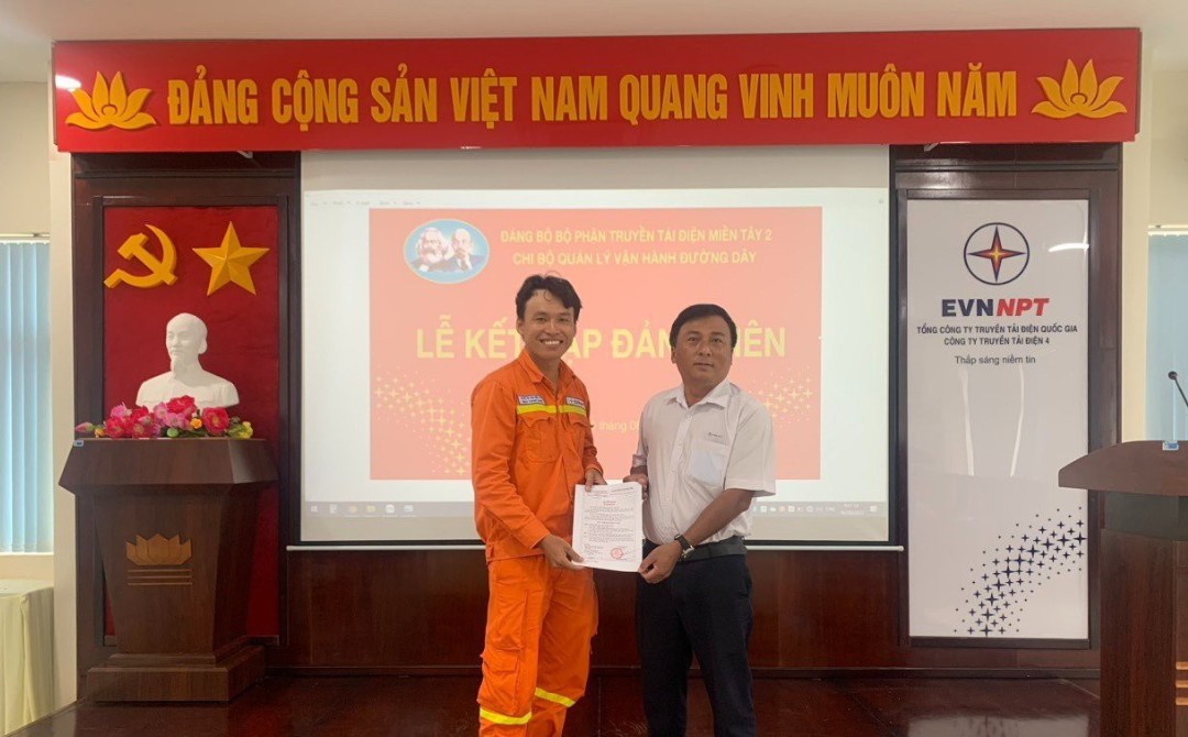 Tham dự Lễ kết nạp đảng viên có đồng chí Nguyễn Văn Tuấn – Bí thư Chi bộ Quản lý vận hành đường dây, Phó Giám đốc TTĐ miền Tây 2, cùng toàn thể các đồng chí đảng viên Chi bộ. Sau lễ chào cờ nghiêm trang đồng chí Nguyễn Văn Tuấn thay mặt cấp ủy Chi bộ Quản lý vận hành đường dây đọc quyết định của Ban Chấp hành Đảng bộ Công ty Truyền tải điện 4 kết nạp quần chúng ưu tú Bạch Thanh Nhơn vào hàng ngũ của Đảng, đồng thời chúc mừng và giao nhiệm vụ cho đảng viên mới kết nạp, phân công đảng viên trong chi bộ tiếp tục giúp đỡ đảng viên mới phấn đấu hoàn thành nhiệm vụ trở thành đảng viên chính thức.