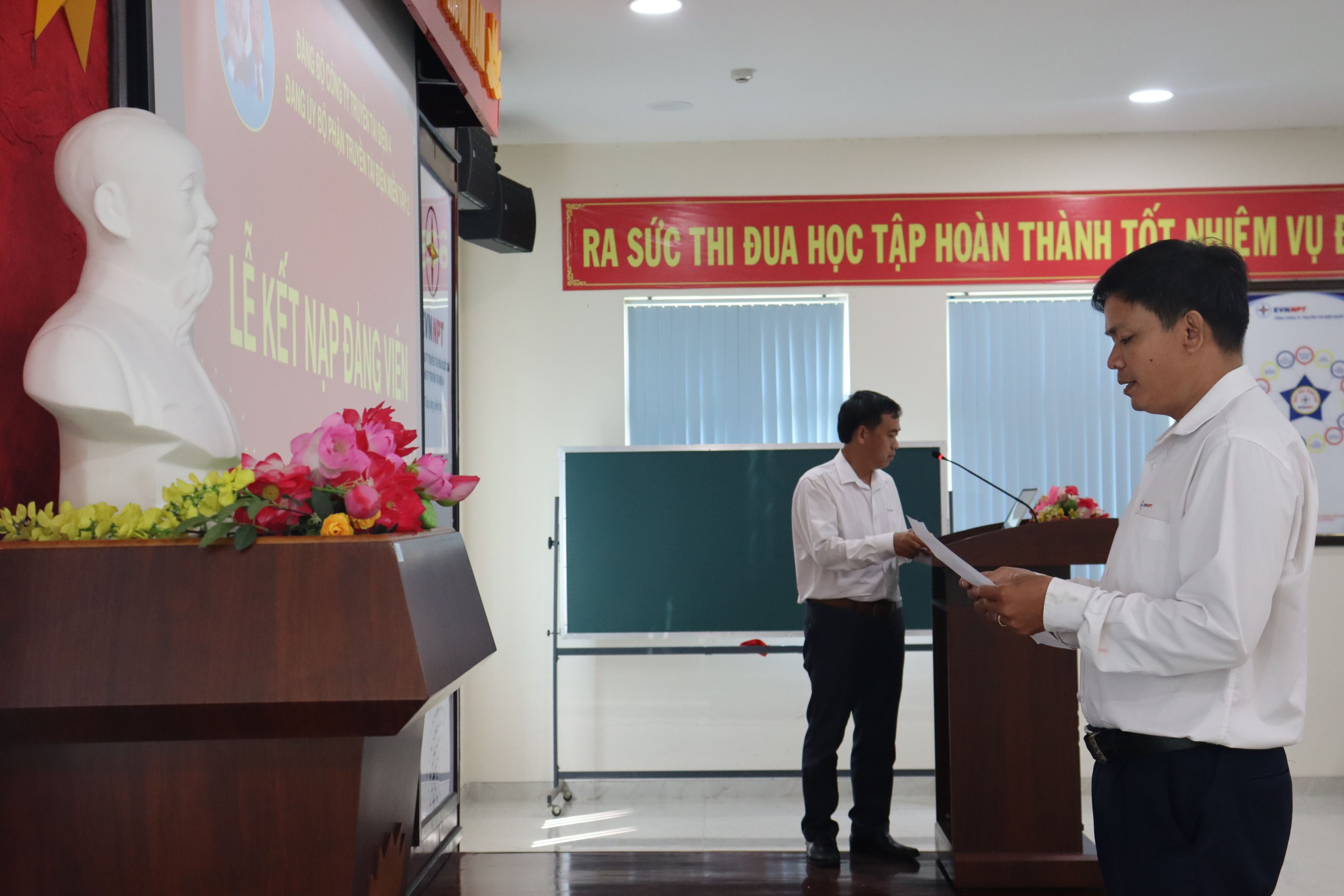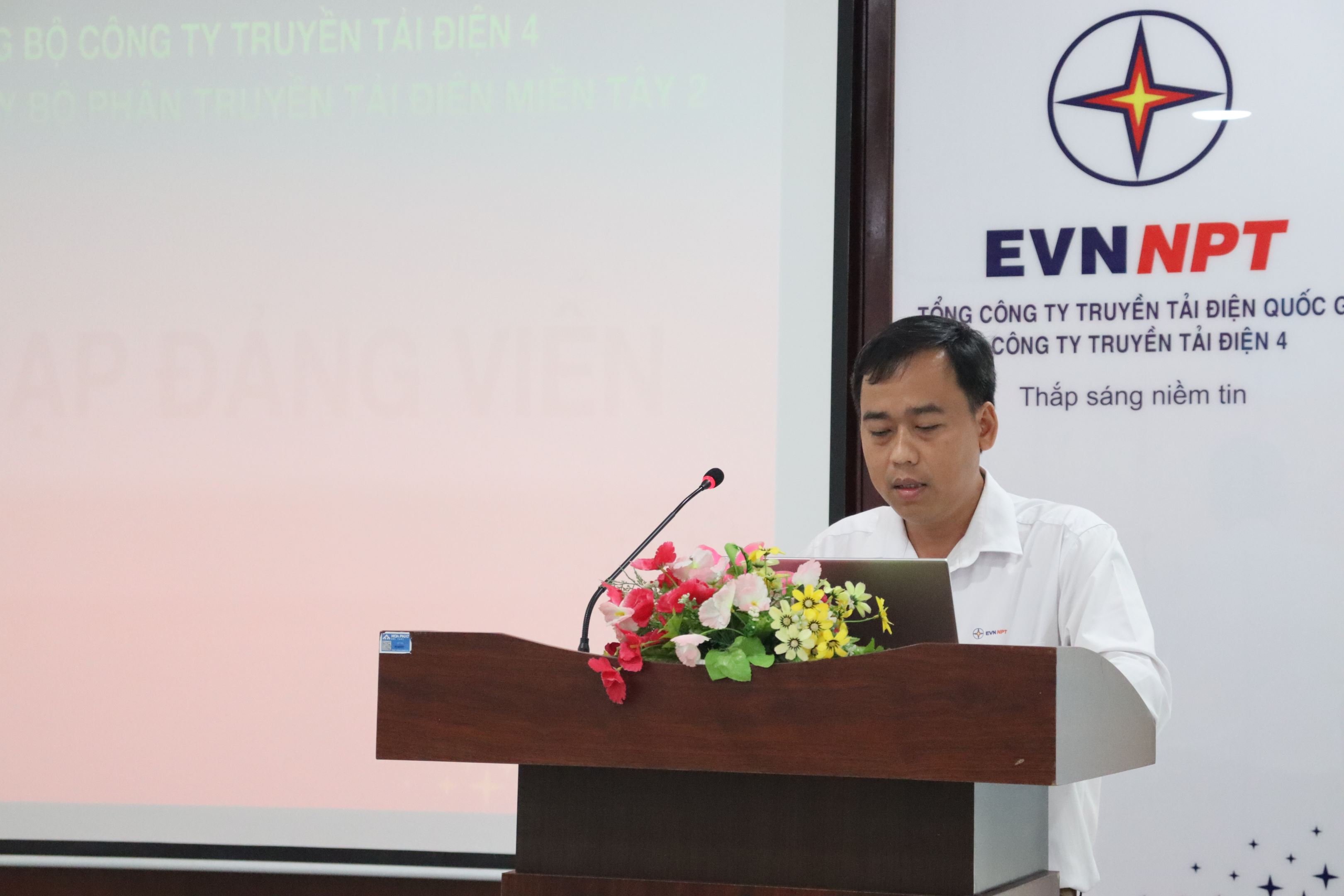 Sau lễ chào cờ nghiêm trang, đồng chí Ngô Mạnh Trung thay mặt Đảng bộ bộ phận Truyền tải điện miền Tây 2 đã đọc và trao quyết định của Ban Chấp hành Đảng bộ Công ty Truyền tải điện 4 kết nạp đảng viên cho 02 đồng chí được vinh dự đứng vào hàng ngũ của Đảng Cộng sản Việt Nam. Đồng thời, đồng chí Ngô Mạnh Trung cũng bày tỏ mong muốn các đảng viên mới kết nạp sẽ tiếp tục giữ gìn phẩm chất đạo đức, nhiệt huyết trong công việc, luôn rèn luyện tu dưỡng, nâng cao bản lĩnh chính trị và năng lực, cùng 2 Chi bộ hoàn thành xuất sắc nhiệm vụ, góp phần xây dựng Đảng bộ bộ phận Truyền tải điện miền Tây 2 ngày càng vững mạnh.