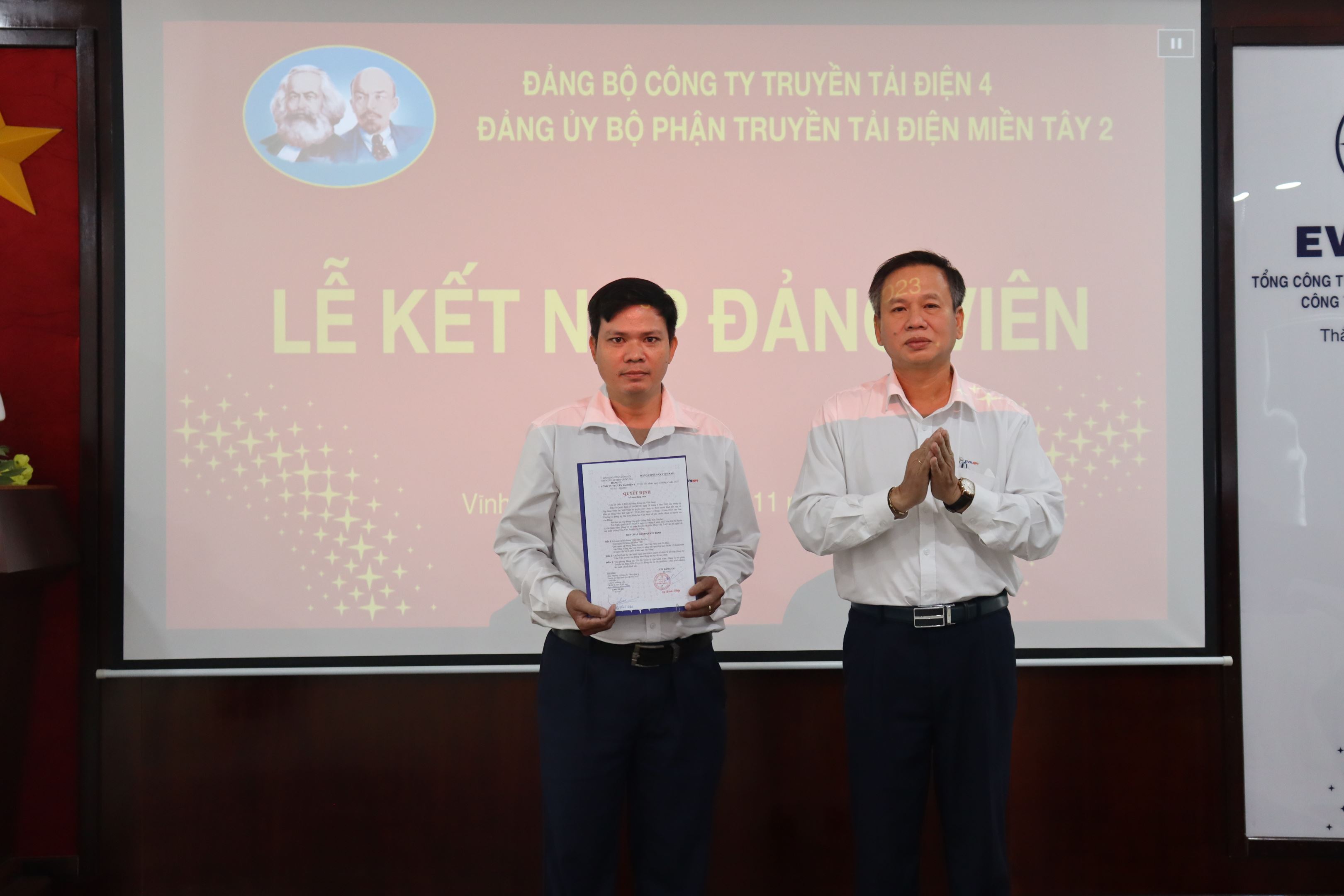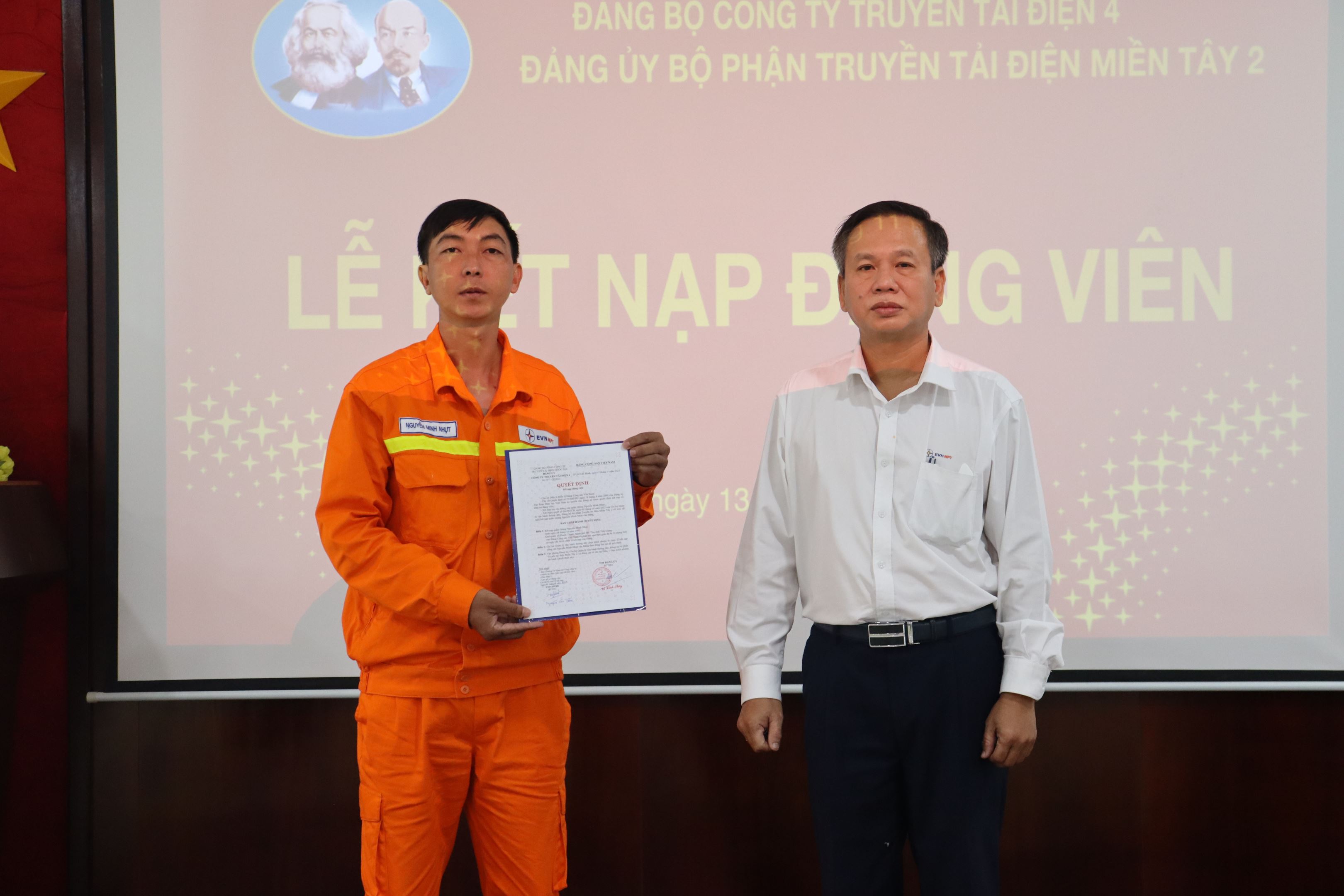 Đồng chí Ngô Mạnh Trung, Bí thư Đảng bộ bộ phận, Giám đốc Truyền tải điện miền Tây 2 trao quyết định kết nạp Đảng cho Đảng viên mới Nguyễn Minh Nhựt