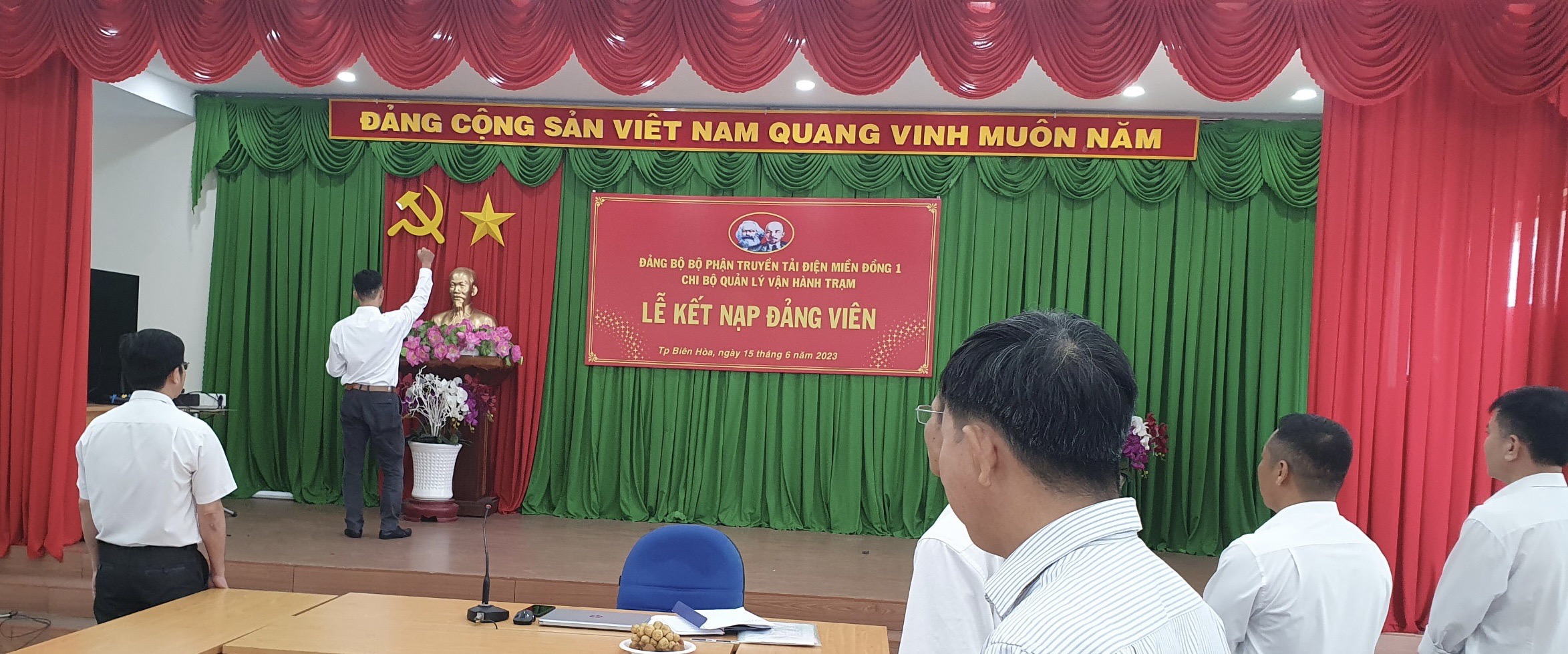 Buổi lễ kết nạp đảng viên mới, được diễn ra trong không khí trang nghiêm, đúng trình tự, thủ tục theo quy trình của Điều lệ Đảng. Thay mặt Chi bộ, đồng chí Nguyễn Tấn Hậu đã trao Quyết định kết nạp Đảng cho 02 quần chúng ưu tú Phạm Văn Thìn và Nguyễn Gia Tứ. Sau nghi thức trao Quyết định, đồng chí Nguyễn Tấn Hậu chúc mừng đồng chí Phạm Văn Thìn và đồng chí Nguyễn Gia Tứ vừa được vinh dự đứng vào hàng ngũ của Đảng Cộng sản Việt Nam; đồng thời mong muốn 02 đồng chí tiếp tục tu dưỡng, rèn luyện phẩm chất đạo đức cách mạng, tích cực học tập, nâng cao trình độ, chuyên môn nghiệp vụ, tích cực trong công tác chuyên môn, hoàn thành xuất sắc nhiệm được được giao, tiếp tục phát huy vai trò là người đoàn viên ưu tú, thực hiện tốt nhiệm vụ của người đảng viên để sau 12 tháng được xét trở thành đảng viên chính thức của Đảng Cộng sản Việt Nam. 02 đảng viên mới đã thực hiện tuyên thệ trước cờ Tổ Quốc, cờ Đảng và chân dung Chủ tịch Hồ Chí Minh và hứa tuyệt đối trung thành với mục đích lý tưởng cách mạng của Đảng, làm tốt nhiệm vụ đảng viên, sẽ tiếp tục phấn đấu để luôn xứng đáng là người đảng viên gương mẫu, đóng góp sức mình thực hiện thành công nhiệm vụ chính trị của Chi bộ Quản lý vận hành trạm, góp phần xây dựng Chi bộ Quản lý vận hành trạm, Đảng bộ bộ phận Truyền tải điện Miền Đông 1, Đảng bộ Công ty Truyền tải điện 4 ngày càng vững mạnh.