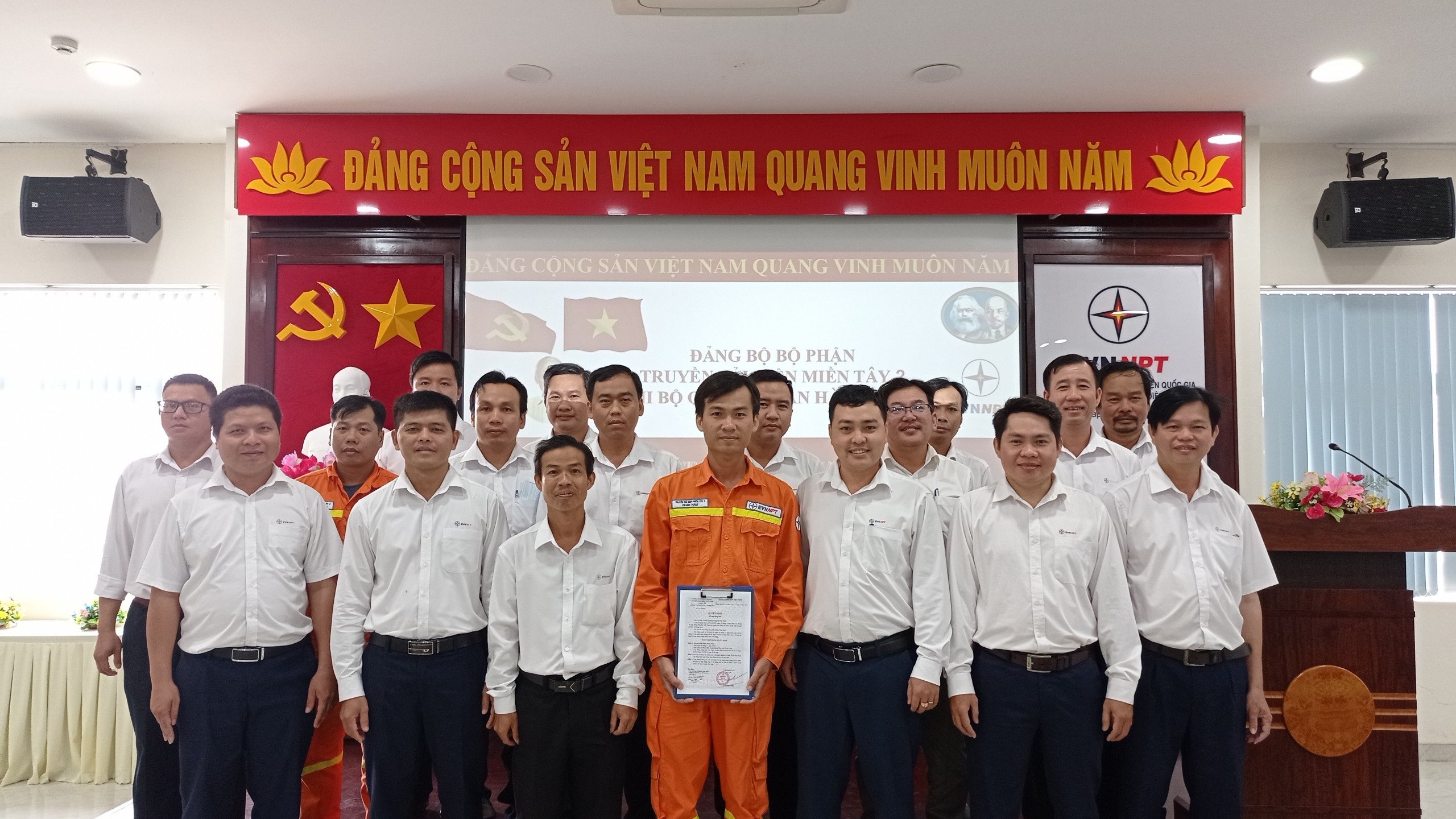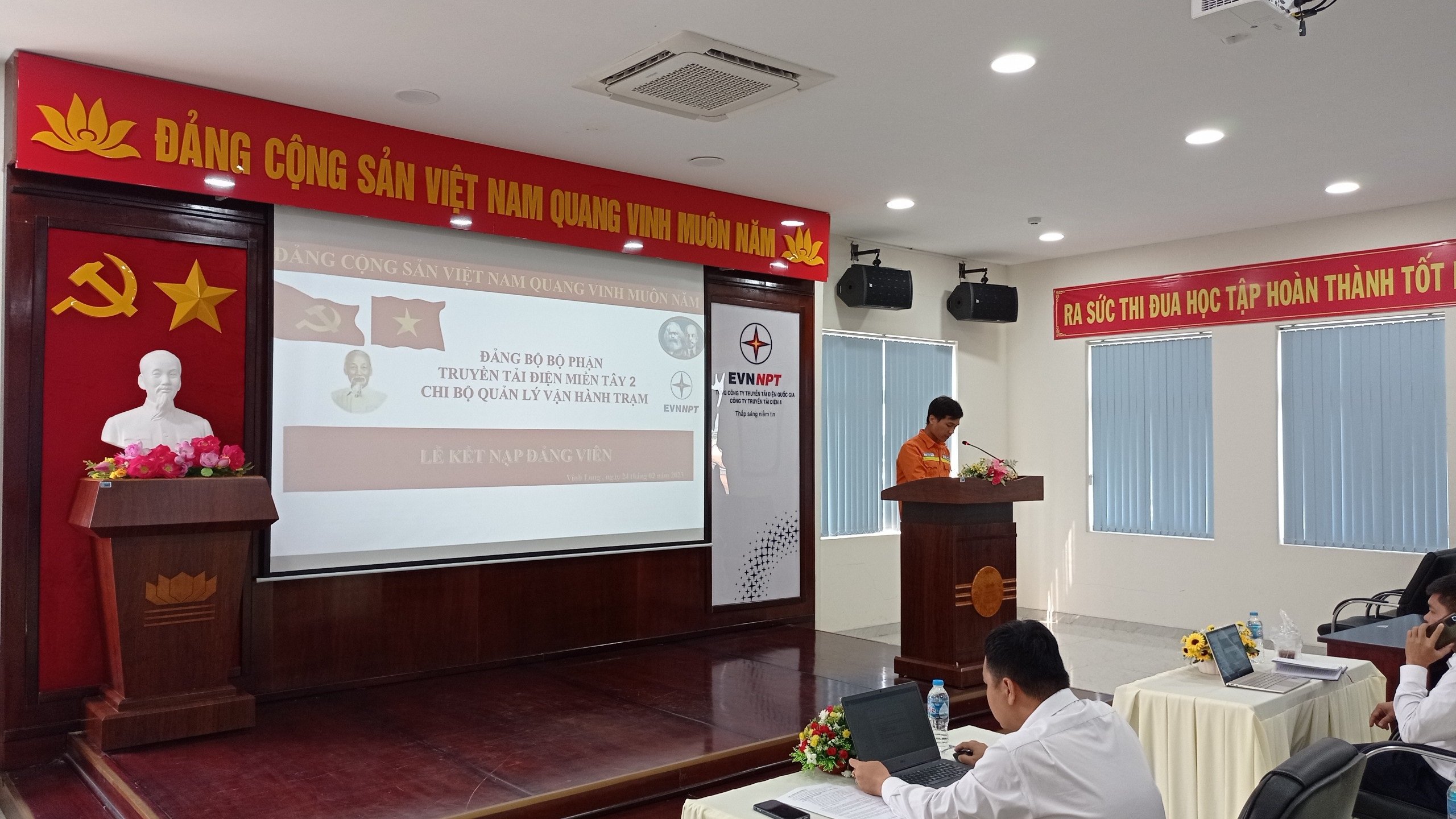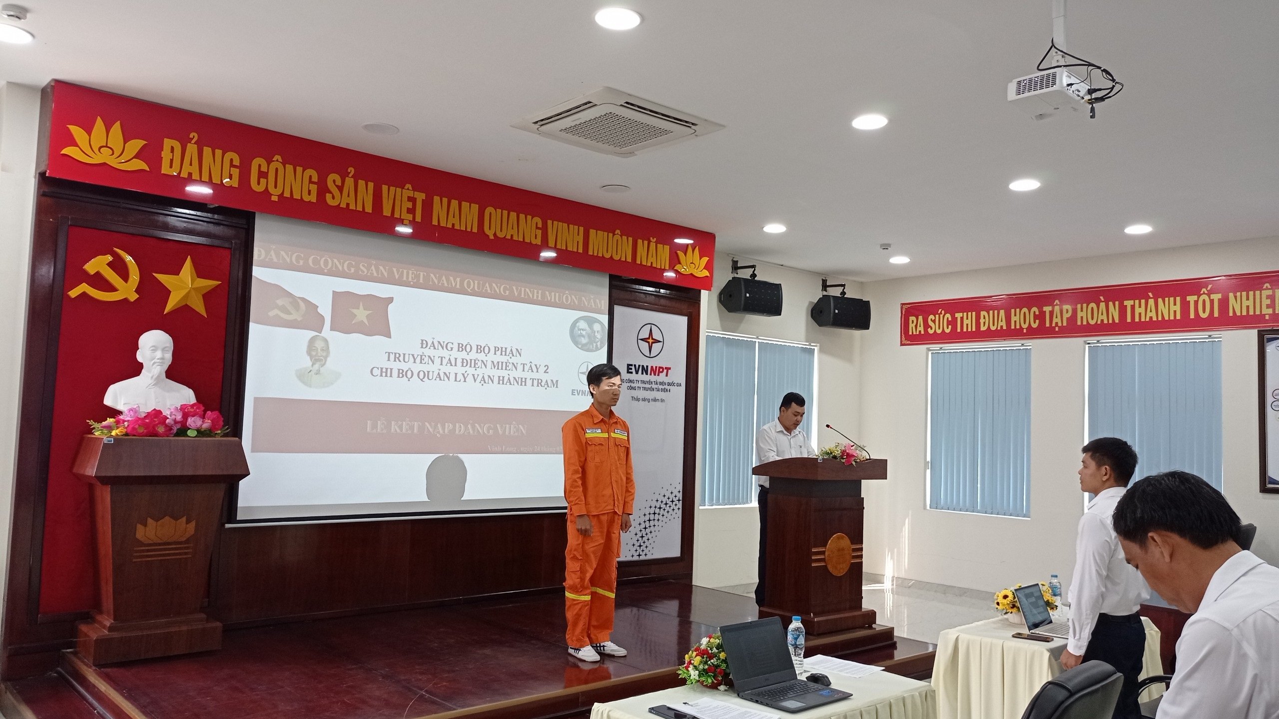 Tham dự Lễ kết nạp đảng viên có đồng chí Mai Hiếu Nghĩa – Phó bí thư Chi bộ Quản lý vận hành trạm TTĐMT2 cùng toàn thể các đồng chí đảng viên trong Chi bộ quản lý vận hành trạm TTĐMT2.