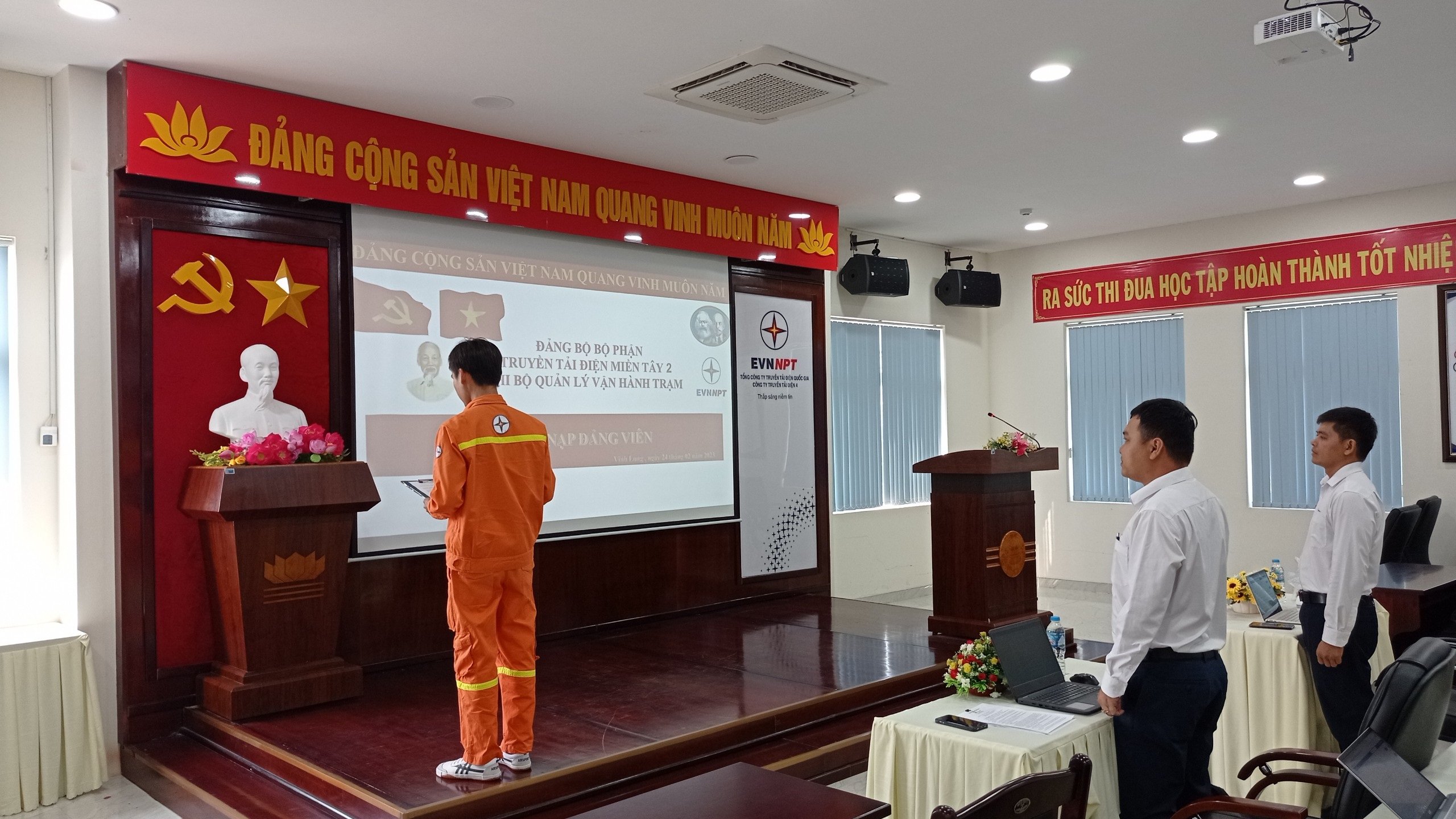Thực hiện theo Điều lệ Đảng Cộng sản Việt Nam và được sự quan tâm của Đảng ủy PTC4, Đảng bộ bộ phận TTĐMT2, Chi bộ quản lý vận hành trạm TTĐMT2, Chi đoàn TTĐMT2, sự giúp đỡ của đảng viên Chi bộ quản lý vận hành trạm TTĐMT2 và sự nỗ lực phấn đấu của bản thân, trải qua quá trình tu dưỡng và rèn luyện của quần chúng Phan Nam, ngày 24/02/2023, Chi bộ Quản lý vận hành trạm TTĐMT2 đã long trọng tổ chức buổi lễ kết nạp Đảng viên mới cho quần chúng ưu tú Phan Nam, sinh năm 1990 là Trực vận hành chính Trạm biến áp 500kV Duyên Hải.
