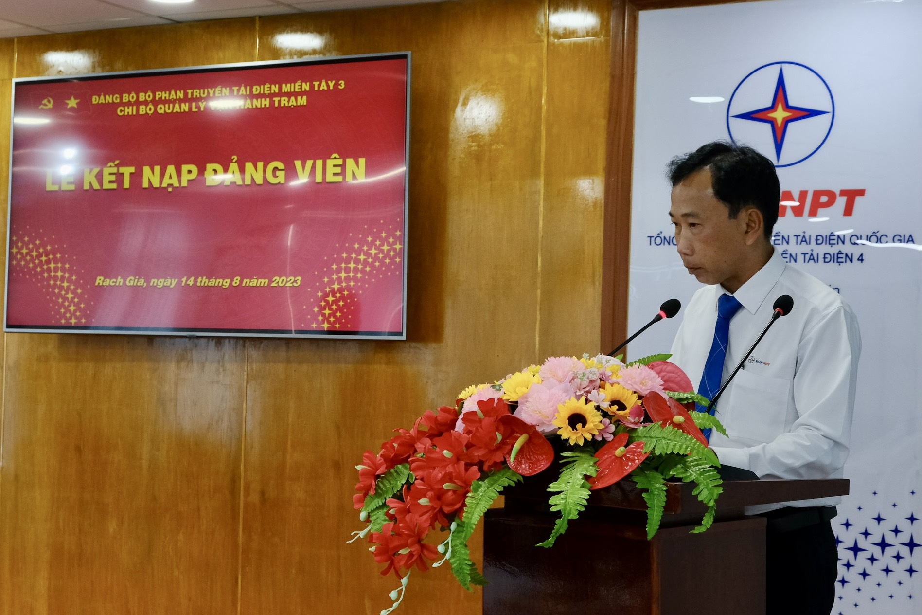 Đại diện chi ủy, đồng chí Huỳnh Võ chúc mừng đồng chí Trần Quốc Sử vừa được vinh dự đứng vào hàng ngũ của Đảng Cộng sản Việt Nam, đồng thời nêu rõ nhiệm vụ, quyền hạn của người Đảng viên, nhiệm vụ của Chi bộ và phân công đảng viên chính thức tiếp tục giúp đỡ đảng viên dự bị. Đồng thời cũng tin tưởng rằng đồng chí đảng viên mới sẽ tiếp tục tu dưỡng, rèn luyện đạo đức, nhân cách, tích cực trong học tập chuyên môn nghiệp vụ và làm tròn trách nhiệm của một người đảng viên, tham gia cùng với Chi bộ hoàn thành xuầt sắc nhiệm vụ được giao, phấn đấu trưởng thành đảng viên chính thức, góp phần cùng với Chi bộ Quản lý vận hành trạm xây dựng Đảng bộ bộ phận Truyền tải điện miền Tây 3, Đảng bộ Công ty Truyền tải điện 4 trong sạch và vững mạnh.