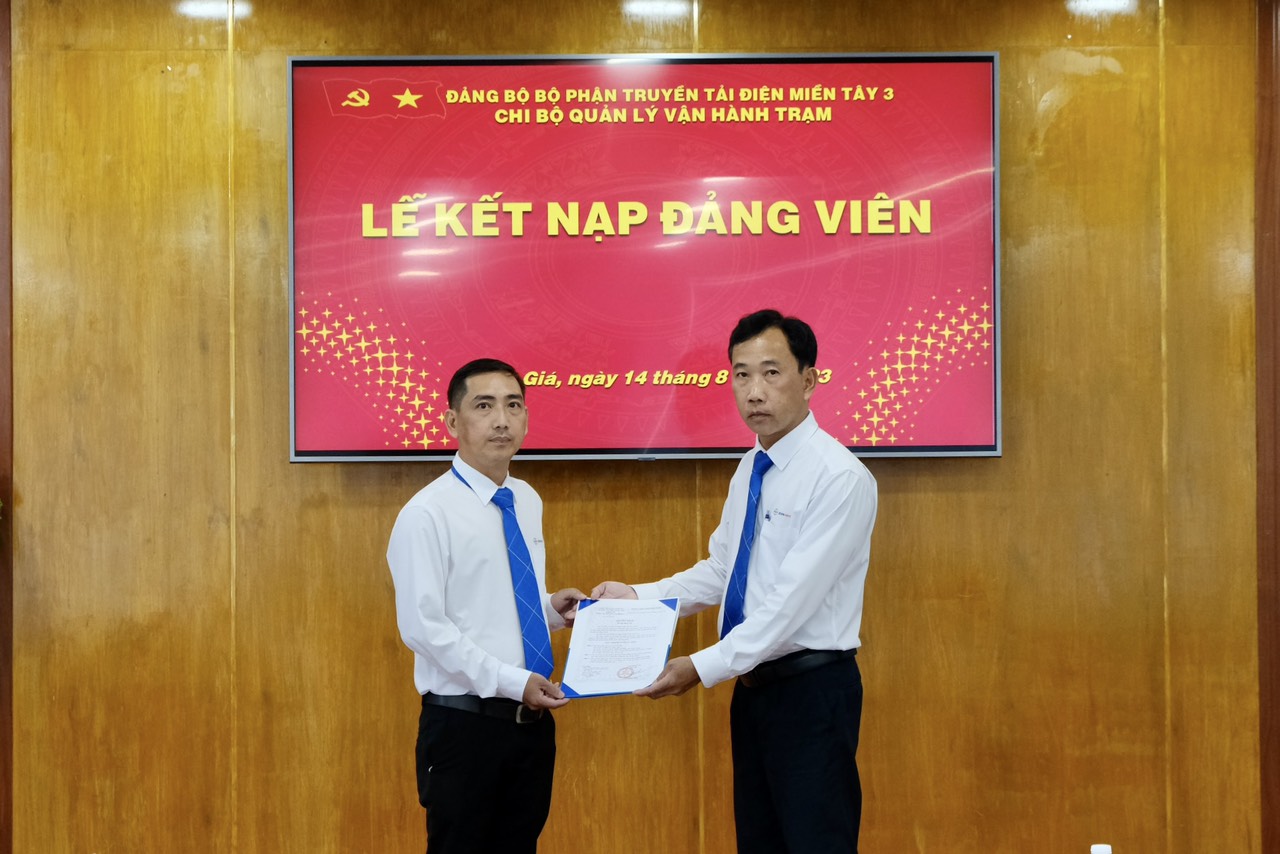 Đồng chí Huỳnh Võ – UVBCH Đảng bộ bộ phận TTĐMT3, Bí thư Chi bộ QLVH trạm (đứng bên phải) trao quyết định kết nạp cho đảng viên mới.