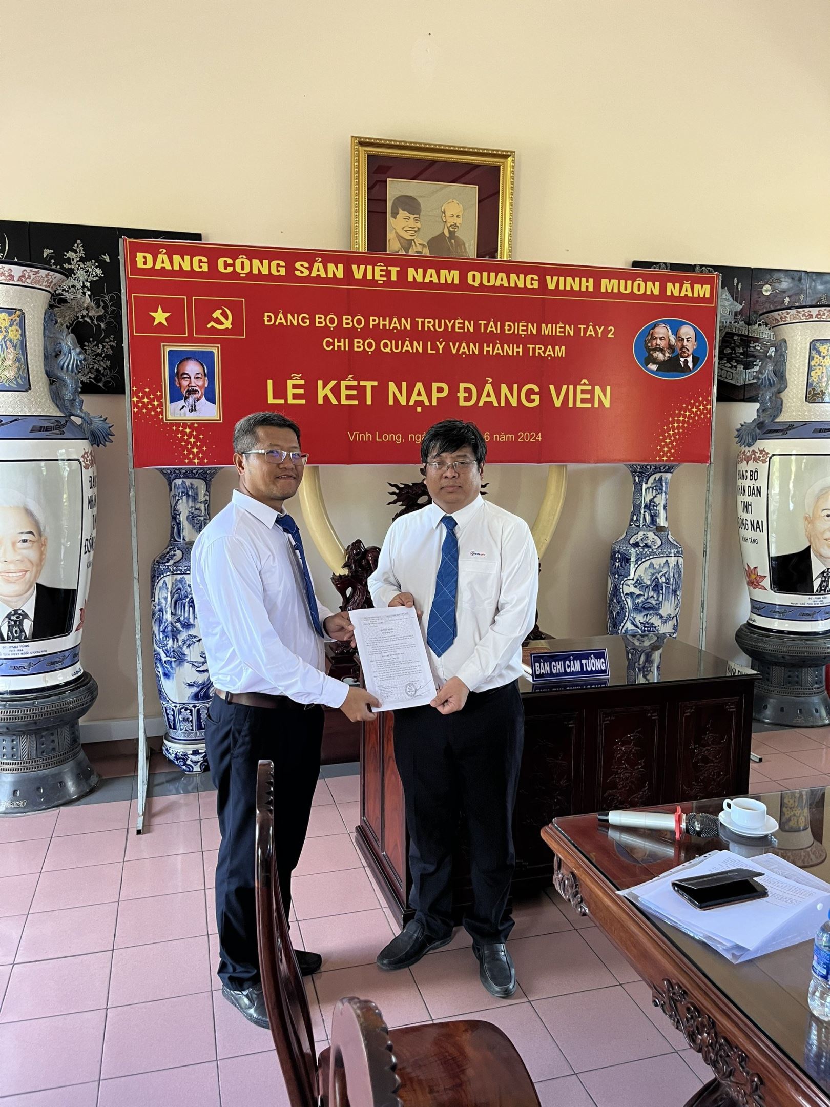 Tham dự buổi lễ có đồng chí Trần Anh Dũng - Bí thư Chi bộ Quản lý vận hành trạm, Phó Giám đốc Truyền tải điện miền Tây 2 và toàn thể các đảng viên đang sinh hoạt tại chi bộ. Quần chúng ưu tú được kết nạp Đảng lần này là đồng chí Nguyễn Lương Tâm - điều hành viên Tổ Thao tác lưu động Vĩnh Long.