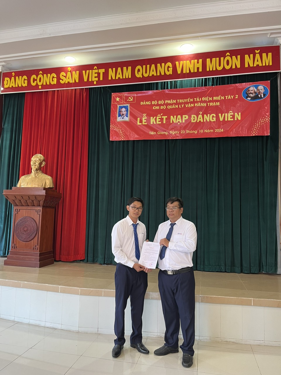 Sau nghi thức chào cờ trang nghiêm, đồng chí Trần Anh Dũng đọc quyết định kết nạp quần chúng ưu tú Mai Thanh Tùng vào Đảng Cộng sản Việt Nam, đồng thời quán triệt nhiệm vụ và quyền hạn của người đảng viên, phân công đảng viên chính thức trong chi bộ tiếp tục giúp đỡ đồng chí Mai Thanh Tùng trong thời gian là đảng viên dự bị, phấn đấu hoàn thành nhiệm vụ để trở thành đảng viên chính thức. Đồng chí Trần Anh Dũng mong muốn đảng viên mới kết nạp sẽ tiếp tục tu dưỡng, rèn luyện, nhiệt tình trong công tác, phát huy năng lực hơn nữa để cùng Chi bộ hoàn thành xuất sắc nhiệm vụ được giao, góp phần xây dựng Chi bộ quản lý vận hành trạm cùng Đảng bộ bộ phận Truyền tải điện miền Tây 2 ngày càng vững mạnh.