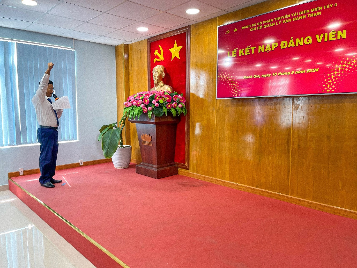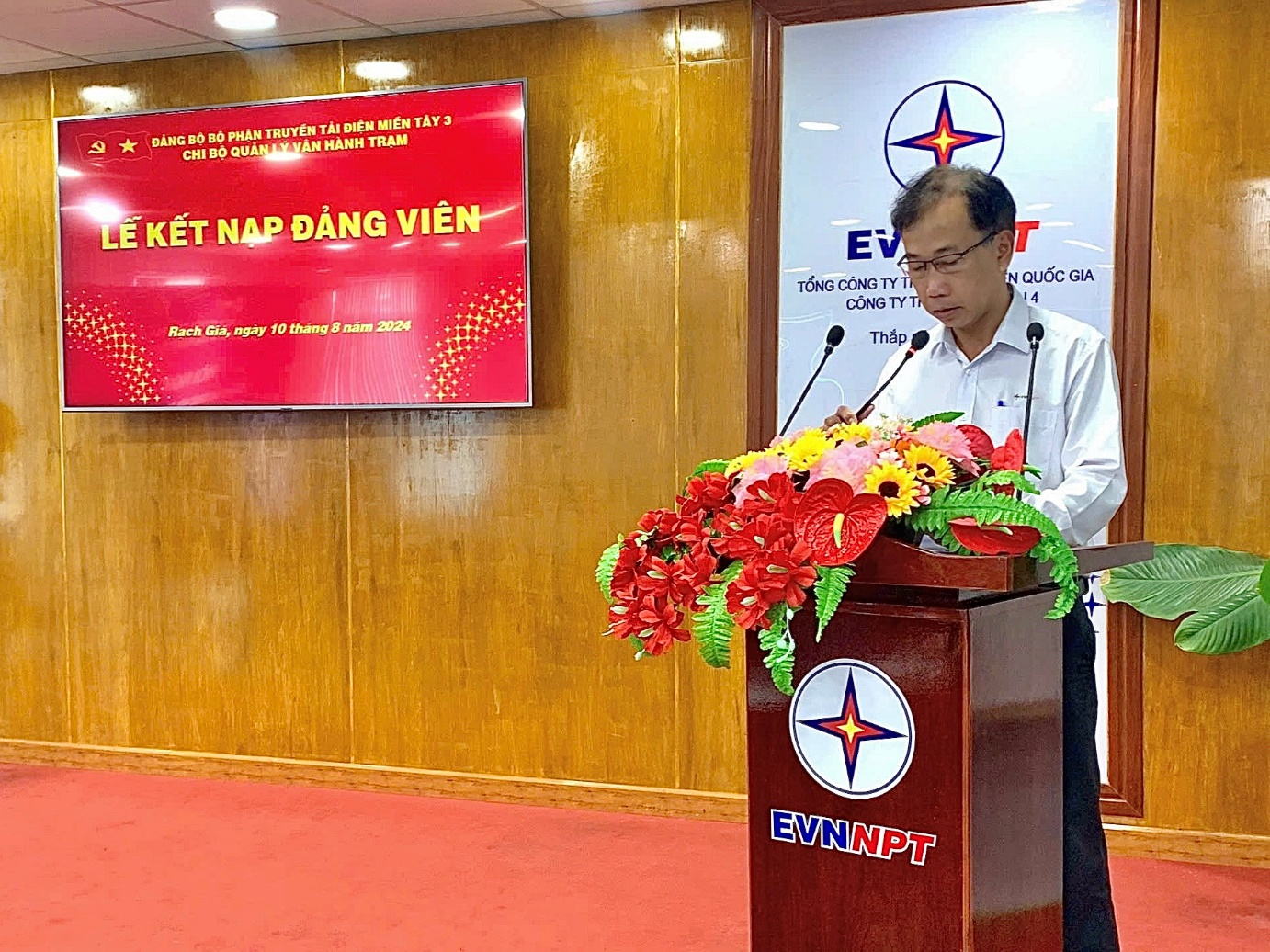 Thực hiện theo điều lệ Đảng Cộng sản Việt Nam, được sự đồng ý của Đảng ủy Công ty Truyền tải điện 4, Đảng bộ bộ phận Truyền tải điện miền Tây 3, ngày 10/8/2024 tại hội trường Truyền tải điện miền Tây 3, Chi bộ Quản lý vận hành trạm đã tổ chức Lễ kết nạp đảng viên mới cho quần chúng ưu tú Phan Hoàng Hiếu – Trực vận hành chính Tổ Thao tác lưu động Long Xuyên vào Đảng Cộng sản Việt Nam. Tham dự Lễ kết nạp đảng viên có đồng chí Huỳnh Võ – UVBCH Đảng bộ bộ phận Truyền tải điện miền Tây 3, Bí thư Chi bộ Quản lý vận hành trạm, Phó Giám đốc Truyền tải điện miền Tây 3 cùng toàn thể đảng viên trong Chi bộ Quản lý vận hành trạm tham dự.