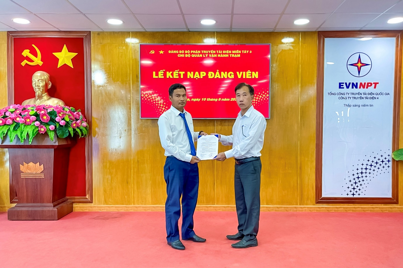Đồng chí Huỳnh Võ, Bí thư Chi bộ Quản lý vận hành trạm (đứng bên phải) trao quyết định kết nạp cho đảng viên mới.
