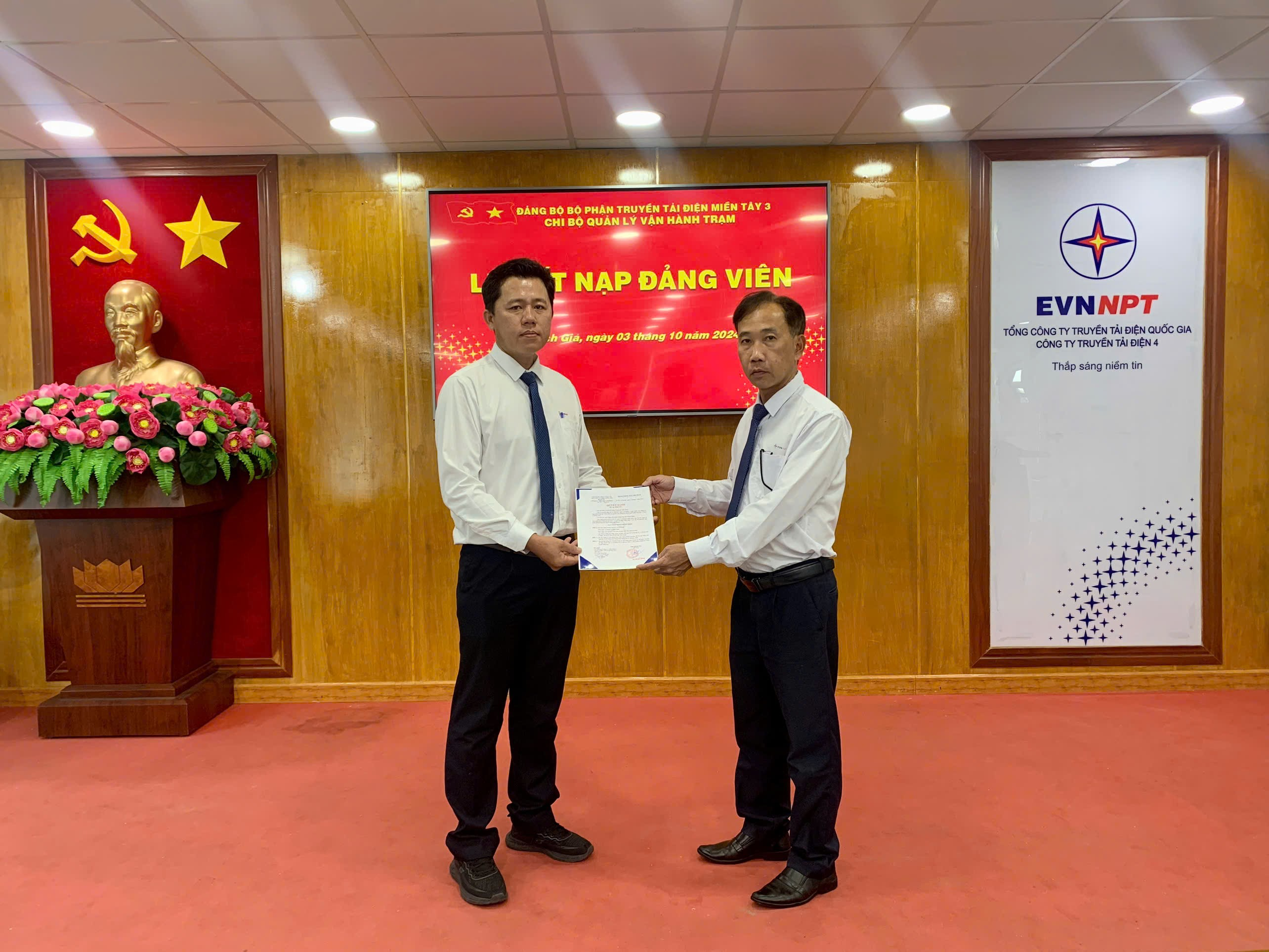 Đồng chí Huỳnh Võ Bí thư Chi bộ Quản lý vận hành trạm (đứng bên phải) trao quyết định kết nạp cho đảng viên mới.