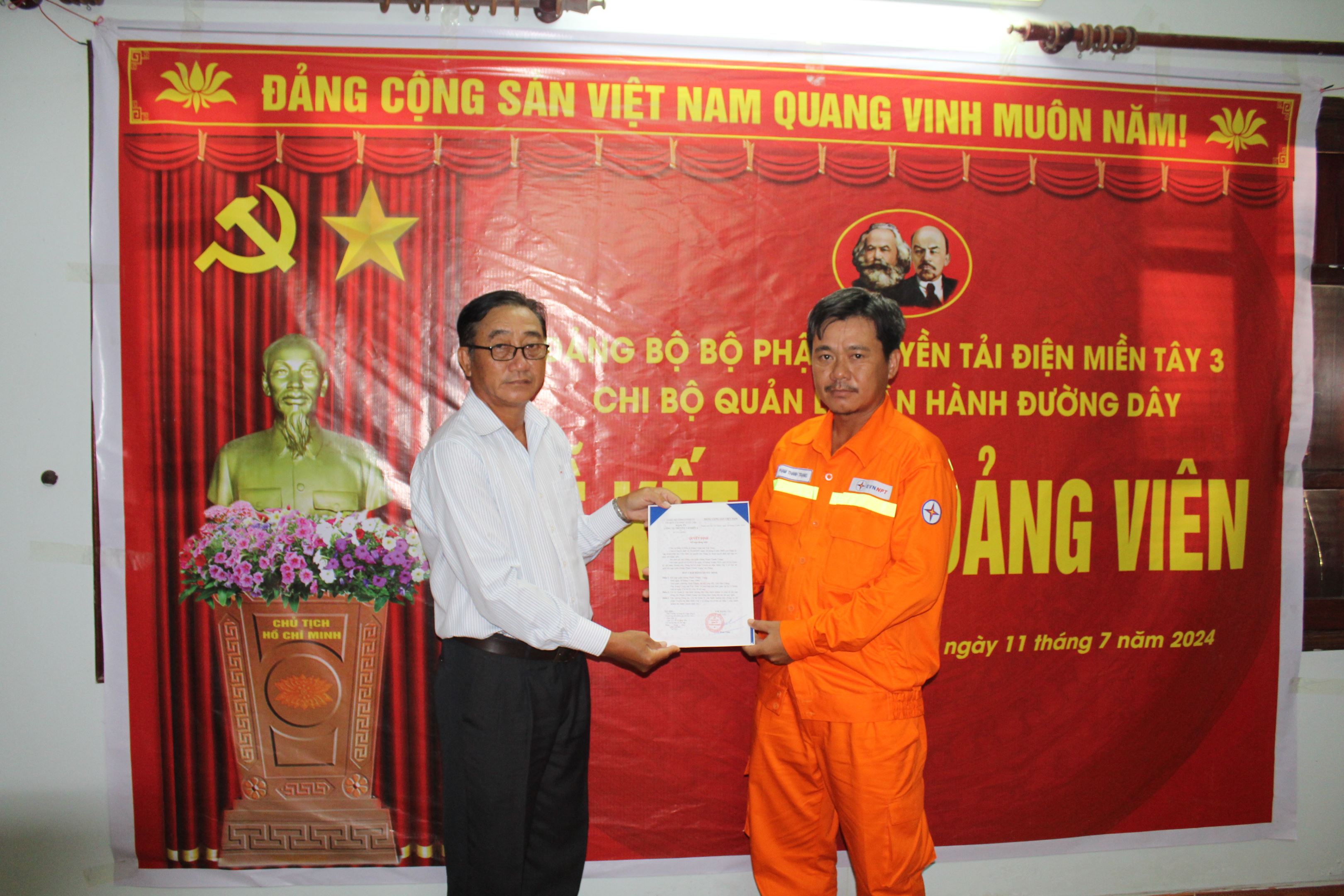 Đồng chí Châu Sóc Kha – Bí thư Chi bộ Quản lý vận hành đường dây, Phó Giám đốc Truyền tải điện miền Tây 3 (trái) trao quyết định kết nạp đảng cho đảng viên mới.