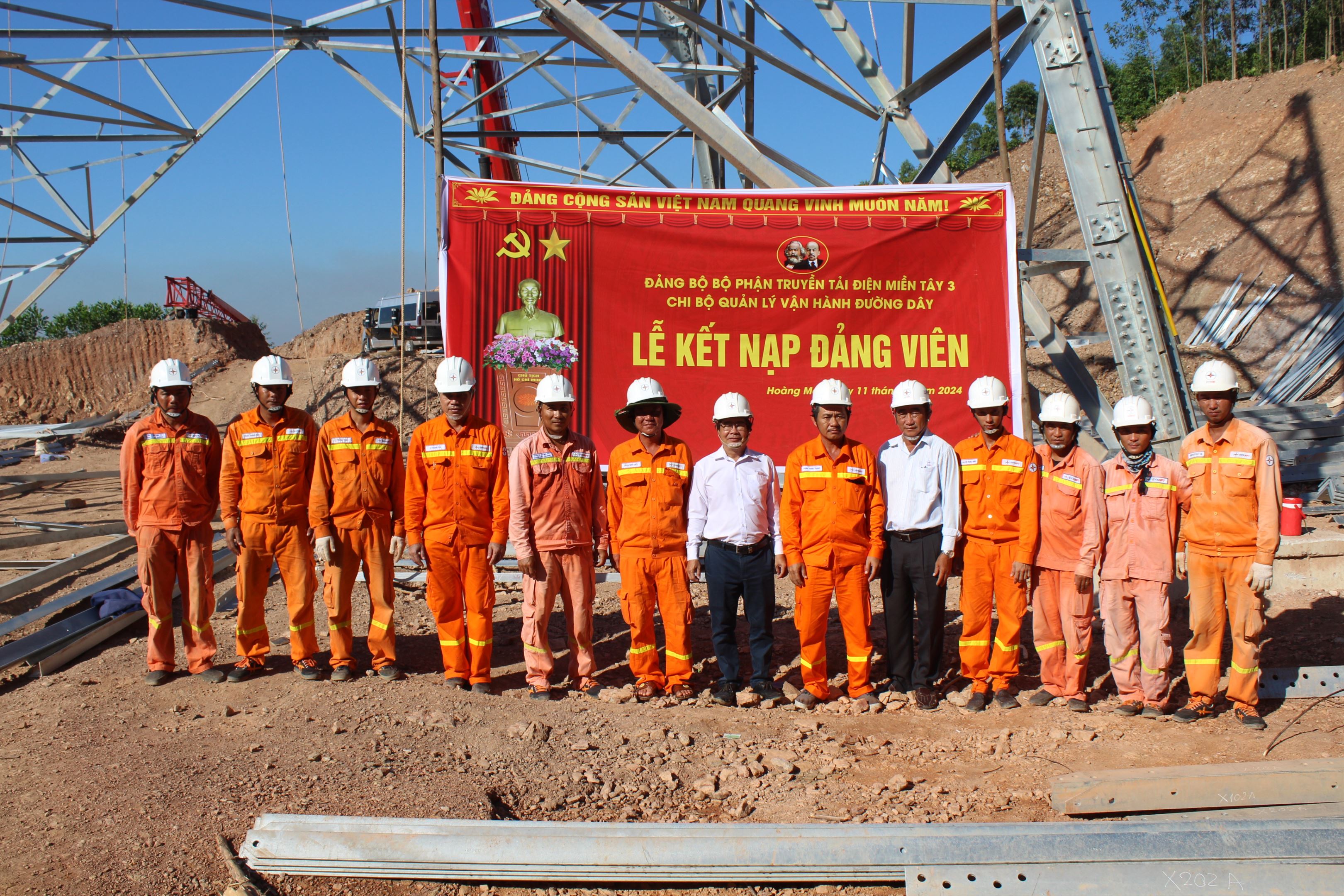Vừa qua, Chi bộ Quản lý vận hành đường dây thuộc Đảng bộ bộ phận Truyền tải điện miền Tây 3 long trọng tổ chức lễ kết nạp đảng viên cho quần chúng ưu tú Phạm Thanh Trạng là Kỹ thuật viên Đội Truyền tải điện Rạch Giá ngay trên công trường Dự án đường dây 500 kV mạch 3 Quảng Trạch – Phố Nối, vị trí 25 cung đoạn Quỳnh Lưu – Thanh Hóa trên địa bàn xã Quỳnh Vinh, Thị xã Hoàng Mai, tỉnh Nghệ An. Tham dự Lễ kết nạp đảng viên có đồng chí Lê Xuân Thụ - UVBCH Đảng bộ Công ty, Bí thư Đảng ủy bộ phận Truyền tải điện miền Tây 3, Giám đốc Truyền tải điện miền Tây 3, đồng chí Châu Sóc Kha – Phó Bí thư Đảng ủy bộ phận Truyền tải điện miền Tây 3, Bí thư Chi bộ Quản lý vận hành đường dây, các đồng chí trong cấp ủy cùng toàn thể các đồng chí đảng viên trong Chi bộ đang tham gia thi công dự án.