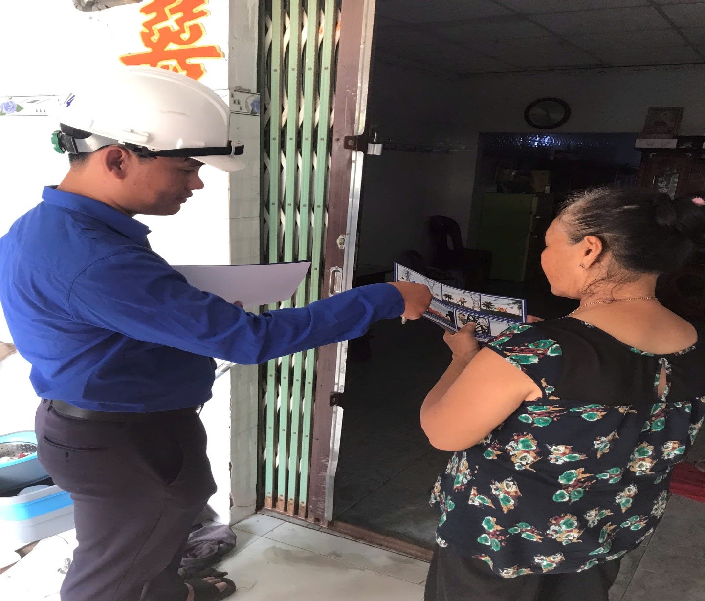 Nhóm 1: Tổ chức tuyên truyền phổ biến đến người dân về các biện pháp phòng ngừa rủi ro về điện nhất là khi mưa bão đến; đồng thời nhóm cũng phổ biến về một số nội dung trích dẫn trong Nghị định 62/2025/NĐ-CP quy định chi tiết Luật Điện lực về bảo vệ công trình điện lực và an toàn lĩnh vực điện lực, cụ thể như Hành lang bảo vệ an toàn trạm điện; Hành lang bảo vệ an toàn đường dây dẫn điện trên không; Nghiêm cấm hành vi thả diều, vật bay gần công trình lưới điện cao áp; Không được trộm cắp hoặc tháo gỡ dây néo, dây tiếp địa, trang thiết bị của lưới điện; không trèo lên cột điện, vào trạm điện hoặc khu vực bảo vệ an toàn công trình điện khi không có nhiệm vụ; Không lắp đặt ăng ten thu phát sóng, dây phơi, giàn giáo, nhà lồng, nhà lưới, biến, hộp đèn quảng cáo và các vật dụng khác tại các vị trí mà khi bị đổ, rơi, văng, rung lắc gây hư hỏng, sự cố công trình điện lực; không bắn, quăng, ném bất kỳ vật gì lên đường dây điện, trạm điện và các công trình điện lực khác.
