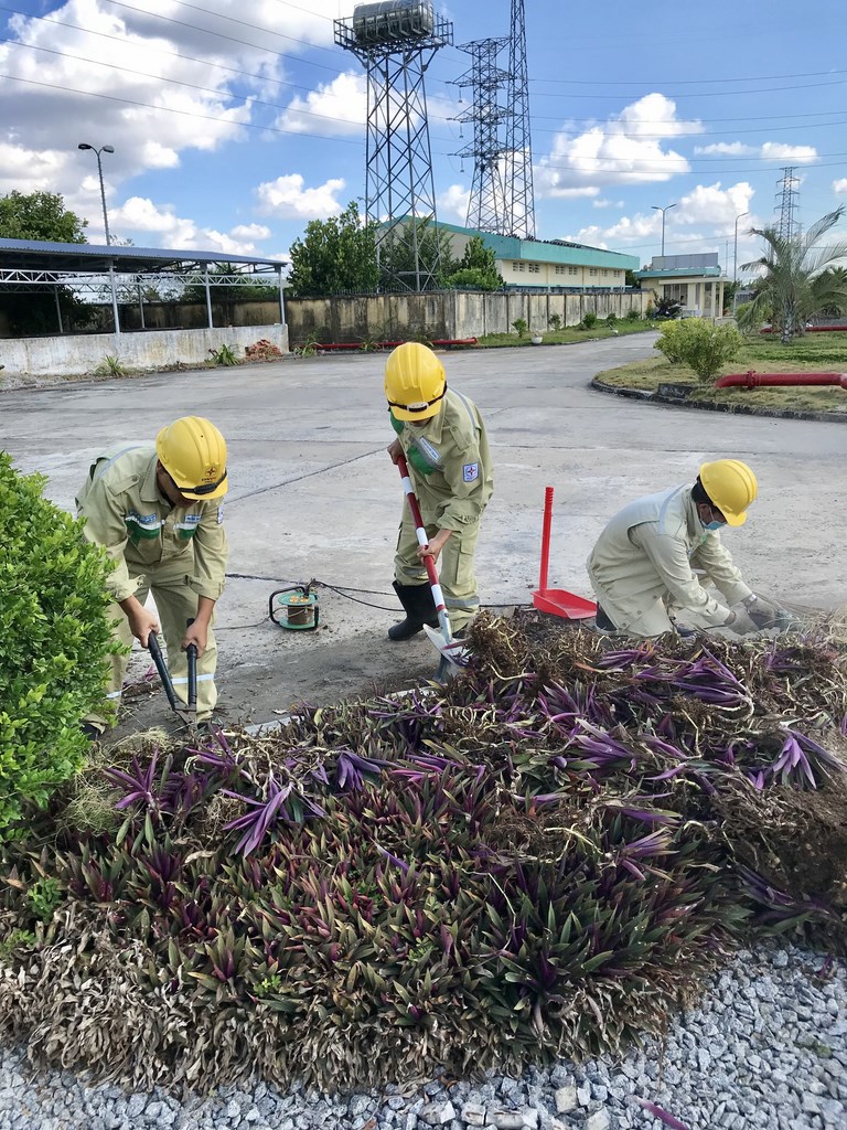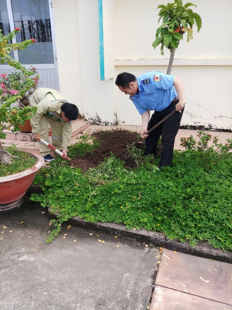 Dọn dẹp cỏ dại và cắt tỉa cây khu vực khuôn viên trạm.