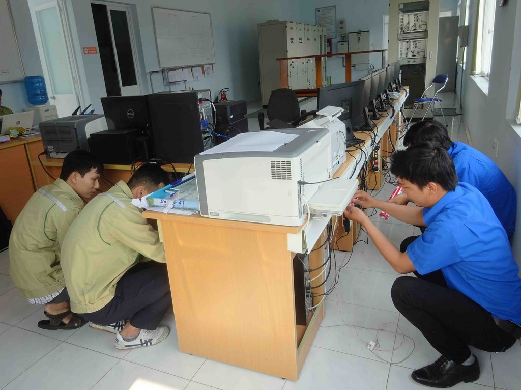 ĐHV tại trạm và đoàn viên TN đang sắp xếp lại phòng điều hành, dời máy tính trạm, hệ thống thông tin